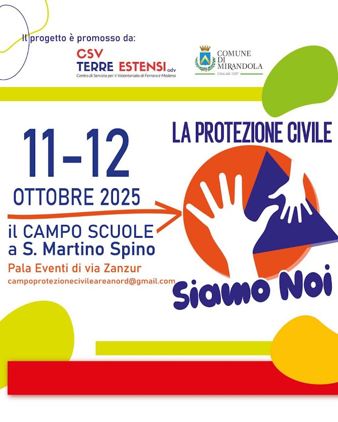 Sabato 11 e Domenica 12 Ottobre Mirandola ospiterà la 16ª edizione del campo formativo “La Protezione Civile Siamo Noi”, promosso dal CSV Terre Estensi in collaborazione con i Gruppi Comunali di Protezione Civile e le Associazioni di volontariato dell’Area Nord modenese.
