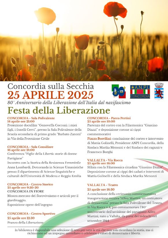 Concordia celebra l’80° Anniversario della Liberazione dell’Italia dal nazifascismo, presentando un ricco programma di iniziative culturali organizzato dall’Amministrazione Comunale in collaborazione con la sezione ANPI di Concordia.