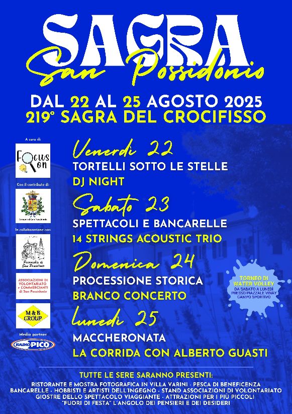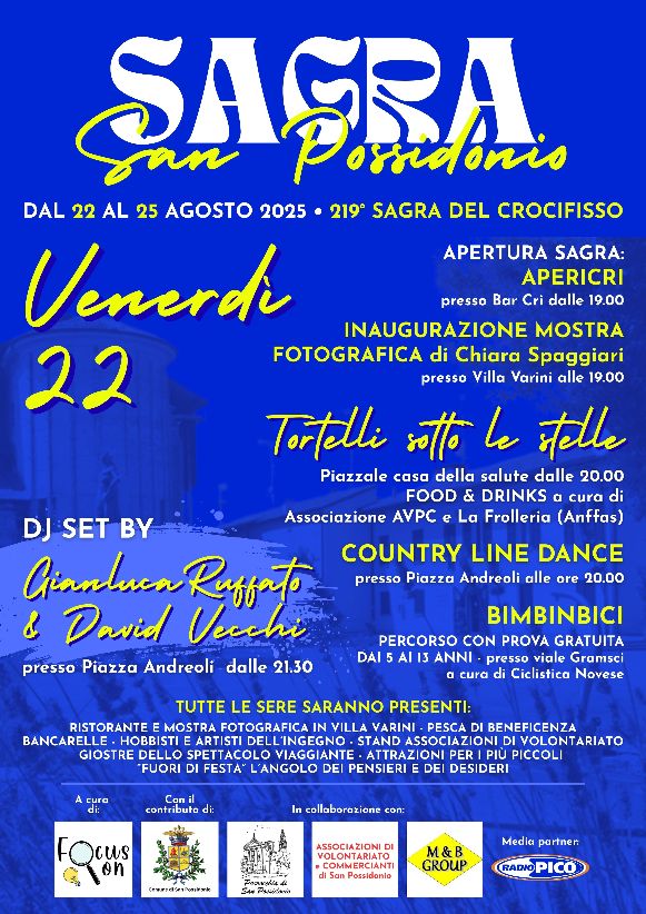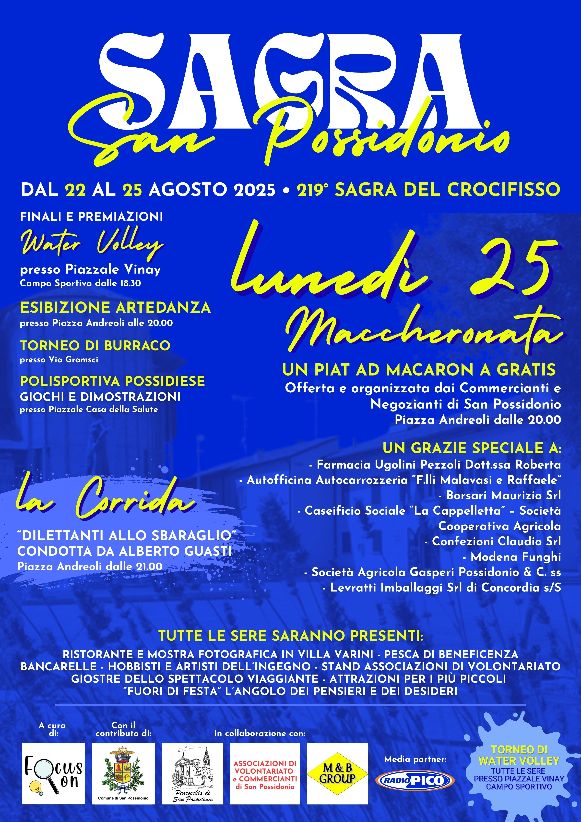 San Possidonio (MO), 19 agosto 2025 – La comunità di San Possidonio si prepara a vivere uno degli eventi più attesi dell’anno: l’edizione 2025 della Sagra del Crocifisso, in programma da venerdì 22 a lunedì 25 agosto. Organizzata dal gruppo Focus On, con il prezioso contributo del Comune e la collaborazione dell’Associazione di Volontariato e Commercianti di San Possidonio, la Sagra si conferma un appuntamento imperdibile, ricco di eventi, spettacoli e momenti di condivisione per tutte le età.