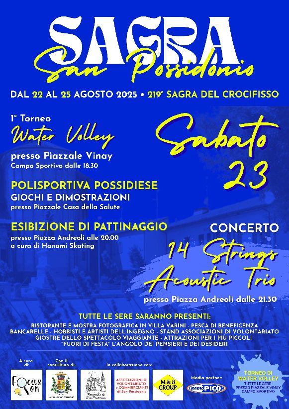 Sabato 23 agosto i riflettori si accenderanno sul palco principale per il live dei Bruskers Trio – 14 Strings Acoustic Trio, pronti a incantare il pubblico con la loro musica. Presso Piazzale Vinay inizio del 1 Torneo di Water Volley , mentre Polisportiva Possidiese curerà uno spazio per giochi e dimostrazioni. Alle ore 20.00 esibizione di pattinaggio a cura di Hanami Skating.