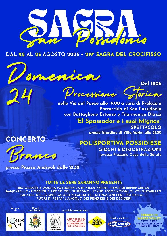 Domenica 24 agosto sarà il momento più sentito e solenne della festa: alle 9.30 Santa Messa presso la Chiesa Parrocchiale di San Possidonio, momento centrale della giornata di festa e di raccoglimento per tutta la comunità, mentre al pomeriggio la suggestiva processione storica attraverserà le vie del paese, rievocando le tradizioni più antiche – a cura della Parrocchia e della Pro Loco e con la partecipazione de Il Battaglione Estense e la Filarmonica Diazzi. A seguire, la piazza si trasformerà in una grande pista da ballo con il concerto live de “Il Branco”, che saprà coinvolgere il pubblico con la sua energia.