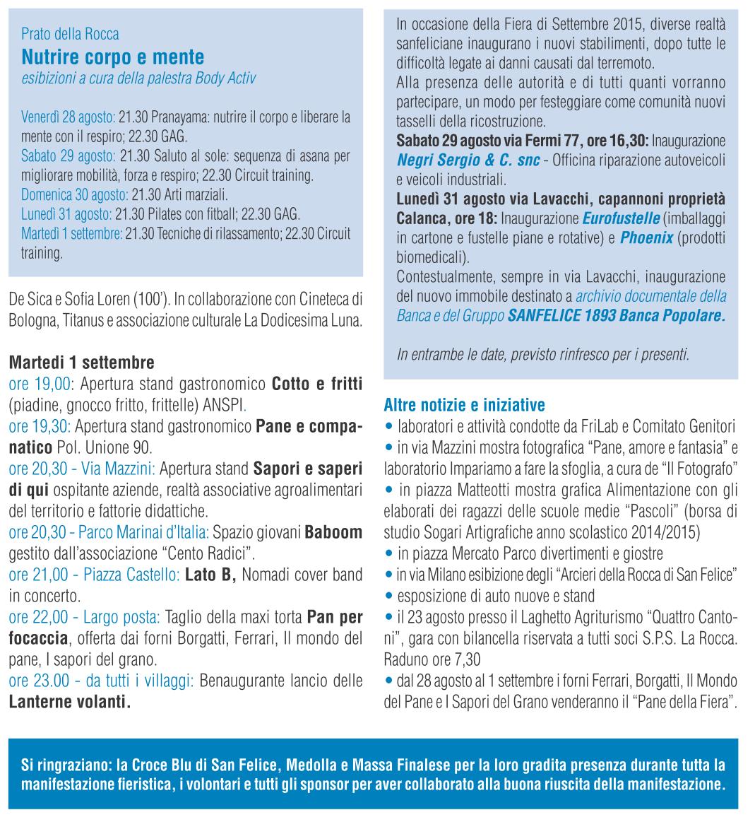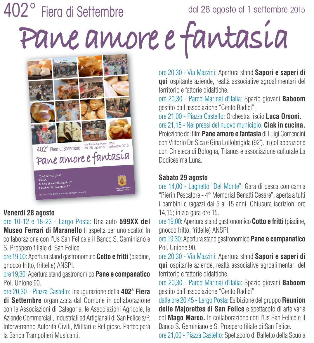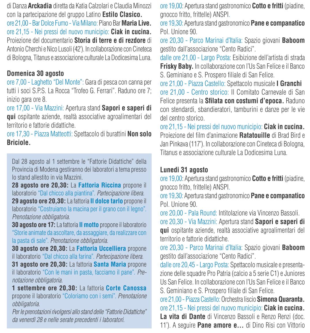 È il pane, il cibo umile per eccellenza, a cui sono legati gesti e tradizioni, il filo conduttore dell’edizione numero 402 della Fiera di Settembre di San Felice sul Panaro, in programma da venerdì 28 agosto a martedì 1 settembre e che quest’anno ha per titolo “Pane amore e fantasia”. L’inaugurazione è in programma venerdì 28 agosto, dalle 20,30, con il corteo che parte da piazza Castello per arrivare all’area di Ri-Commerciamo con la partecipazione anche di musicisti sui trampoli. Protagonisti della fiera saranno le aziende, le imprese e le associazioni organizzate quest’anno oltre che in “aree stand”, anche in villaggi tematici, organizzati con casette di legno, che daranno vita a momenti di incontro, informazione e animazione, dove le tradizioni del territorio si intrecceranno anche con le culture dei differenti gruppi etnici presenti nella comunità. «La scelta di un tema universale come quello del pane e della lievitazione – sottolinea Alberto Silvestri, sindaco di San Felice sul Panaro – ribadisce l’importanza della ricerca di quello che ci unisce piuttosto che di quello che ci divide. La conoscenza alla base del dialogo, quel dialogo indispensabile per ogni civile e pacifica convivenza. Diverse realtà sanfeliciane, inoltre, durante questi giorni di festa, inaugureranno le rispettive sedi, nuove o recuperate dopo i danni causati dal sisma. Ritengo particolarmente significativo che ciò avvenga durante la Fiera, con l’invito a partecipare a queste “feste nella festa” rivolto a tutta la comunità. Insieme abbiamo attraversato i momenti più difficili, insieme è giusto festeggiare ogni singolo tassello della ricostruzione che va ad arricchire e rendere migliore la nuova San Felice». Gli stand commerciali si trovano lungo viale Campi, mentre tutte le vie e le piazze di San Felice faranno da sfondo alle proposte espositive delle associazioni sociali e sportive. Non mancheranno spettacoli, degustazioni e appuntamenti anche per i più piccoli, come esibizioni di burattini, laboratori creativi, mentre le “Fattorie Didattiche” della Provincia di Modena gestiranno dei laboratori a tema dedicati al tema della lavorazione del pane, nello stand allestito in via Mazzini. Tra le conferme lo spazio giovani, al Parco Marinai d’italia, con tanta musica e animazioni varie, così come le giostre del luna park in piazza E. Piva (piazza Mercato) e il ristorante gestito dai volontari del mondo dell’associazionismo sul prato della Rocca Estense, con le specialità tipiche della cucina locale. Tra gli appuntamenti culturali spiccano quelli che riguardano la figura di Vincenzo Bassoli, sanfeliciano e tra i primi critici cinematografici italiani, cui verrà intitolata una via lunedì 31 agosto. Un modo per ricordare un personaggio capace di distinguersi a livello nazionale nel proprio campo, pur rimanendo sempre legato alle sue origini. In programma anche proiezioni di film, spettacoli musicali, mostre fotografiche, sfilate in costume d’epoca e stand gastronomici dedicati al pane.
