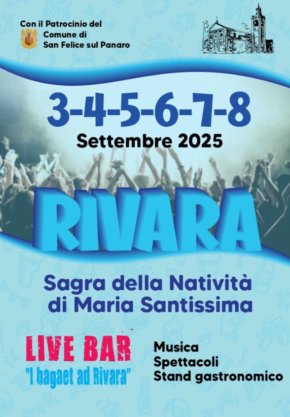 Dal 3 all’8 settembre torna a Rivara di San Felice sul Panaro la Sagra della Natività di Maria Santissima. La manifestazione, organizzata dalla Parrocchia con il patrocino del Comune, presenta un programma religioso e uno ricreativo, con musica, spettacoli, stand gastronomico con gustose specialità locali e live bar. Per quanto riguarda il programma ricreativo mercoledì 3 settembre alle 19.30 è prevista l’inaugurazione della Sagra. Alle 20, al campo sportivo parrocchiale, si svolgerà il torneo di calcio dell’amicizia, riservato ai bambini.