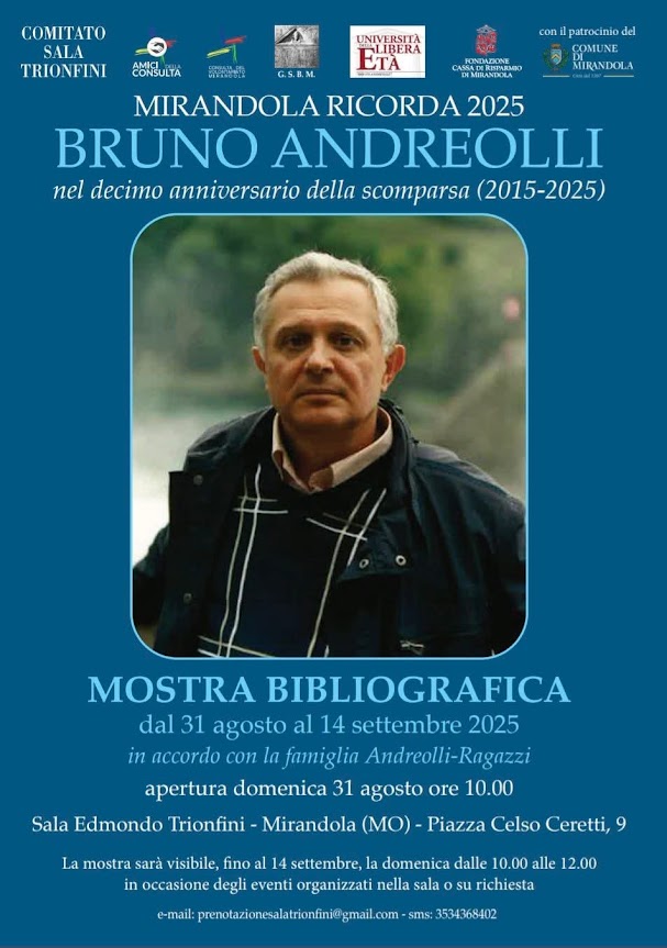 L’Associazione Amici della Consulta, il Comitato Sala Trionfini, in accordo con la famiglia Andreolli-Ragazzi, organizzano presso la Sala Edmondo Trionfini in Piazza Celso Ceretti n. 9 a Mirandola, la Mostra Bibliografica Mirandola Ricorda 2025 – Bruno Andreolli a dieci anni dalla scomparsa (2015-2025)