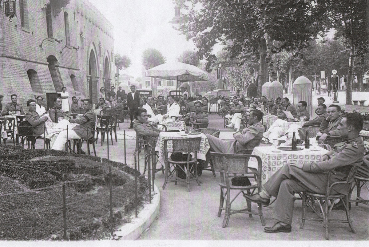Come si potrà notare da questa foto (gentilmente concessa da Gianni Malavasi titolare della pizzeria Da Arnold) già negli anni trenta davanti al Castello c’era un bar frequentato, a quanto pare, dalla milizia fascista. Il particolare curioso sono quegli ombrelli ricoperti di tela di fianco ai tavolini. Sono un ornamento o servivano la sera per illuminare con luci soffuse il bar?