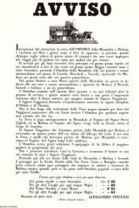 La nuova gestione fece immediatamente affiggere in vari punti della Città il qui riprodoto avviso notificando la ripresa del servizio dell’Omnibus ma con grande stupore del Vincenzi tutti gli avvisi vennero immediatamente stracciati dai vetturali privati che intendevano di opporsi a tale attivazione del servizio.