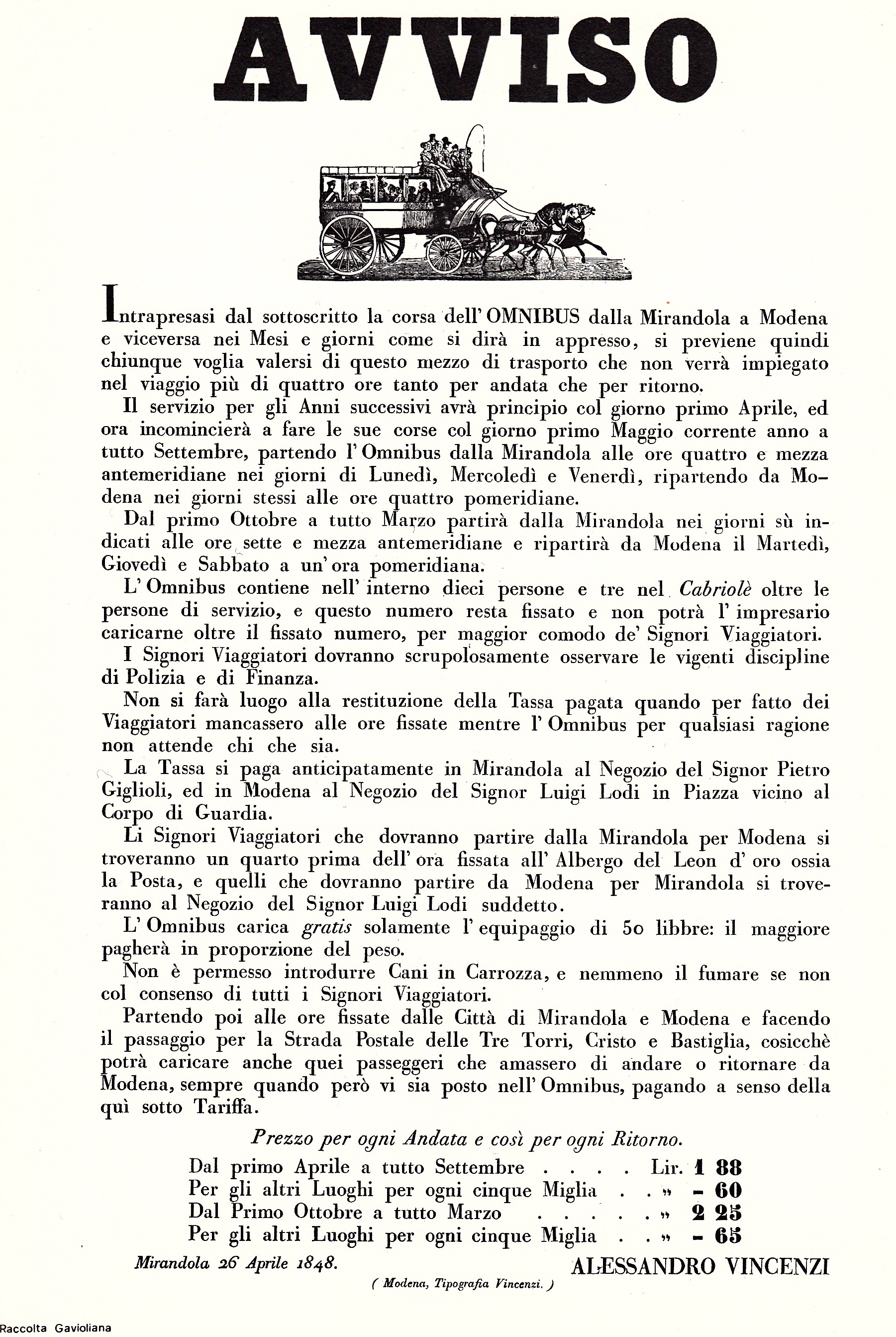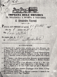Il 14 Luglio dello stesso anno il Vincenzi partì per Modena con 2 Omnibus di cui uno nuovo in modo da poter trasportare circa trenta persone.