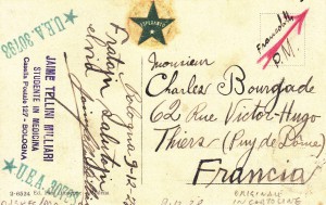 Il primo riscontro esperantista a Mirandola risale al 1928 ed è visibile presso la biblioteca Picus degli Sgarbanti (che si appresta a diventare piccolo Museo locale in quanto la raccolta di ogni genere di“materiale” mirandolese e delle terre dei Pico si va sempre più allargando e aprendo a diverse collezioni) in una cartolina del 1928 con una bella veduta di via Cavallotti spedita da Bologna verso la Francia a firma dello studente di medicina Tellini Milliari alla cui famiglia ancora oggi è intitolato il gruppo esperantista bolognese.