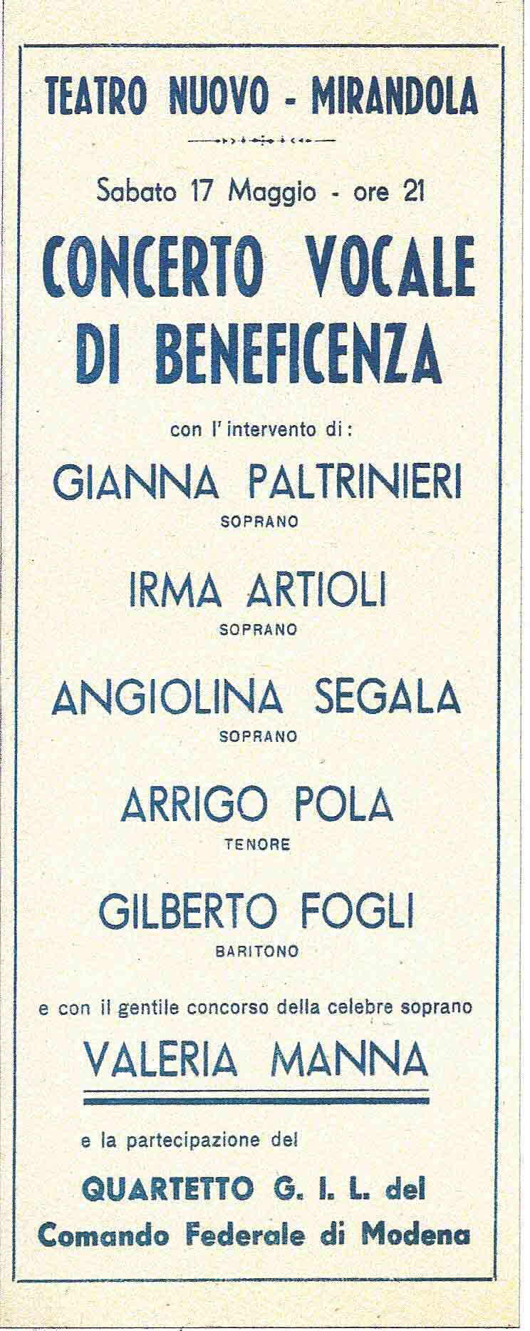 La sera del 17 maggio 1941 fu al teatro Nuovo per un concerto vocale per beneficenza con il tenore Arrigo Pola che nel 1988 fu insignito del premio “Pico d’Oro” dall’Associazione “Amici della Musica” di Mirandola.