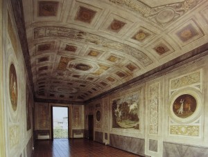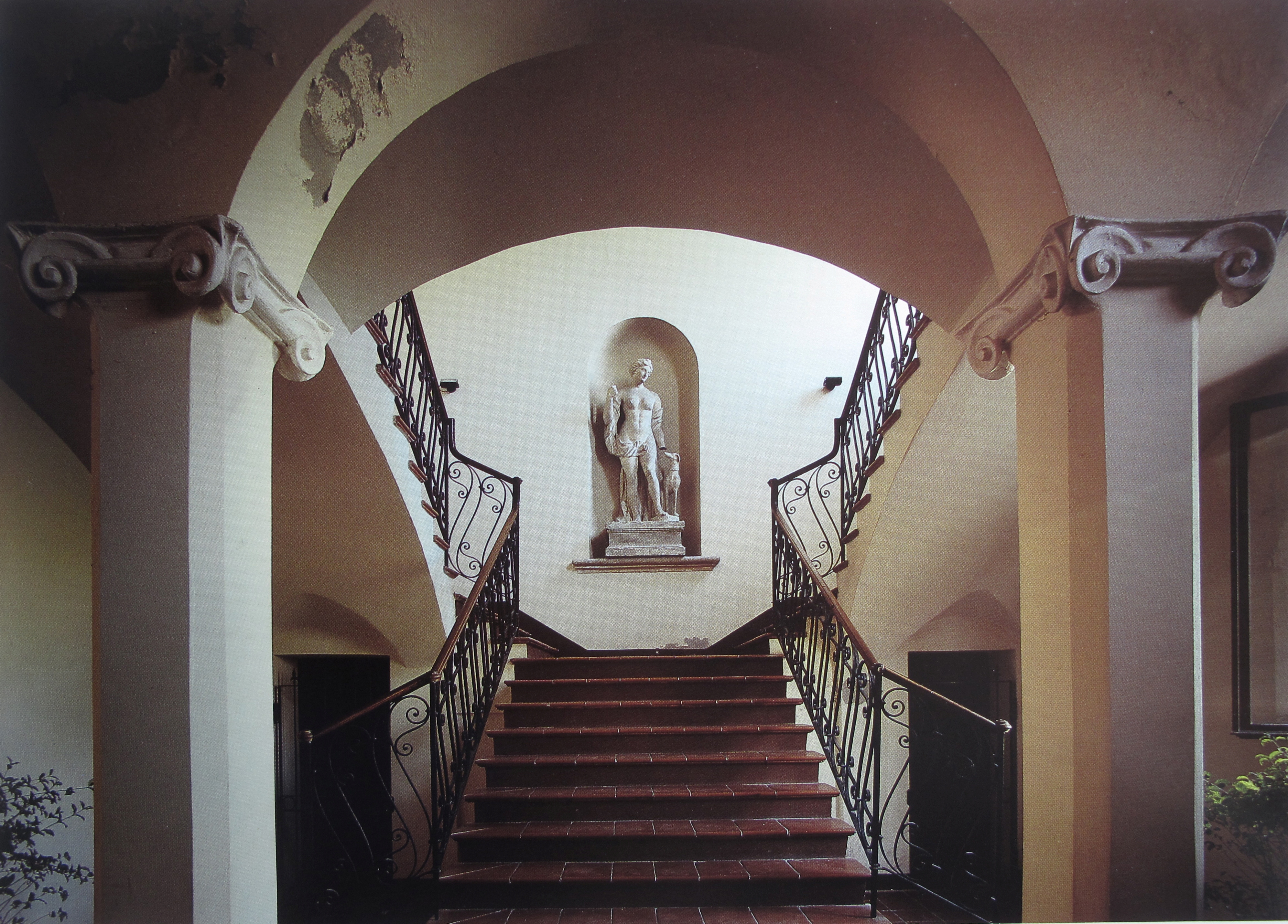 Dall’atrio pausato da pilastri smussati si diparte l’elegante vano scala, con lo scaloncino a tre rampe sovrastato dallo stemma di famiglia e un fondale con la bella statua di Diana in stucco di fattura tardosettecentesca.