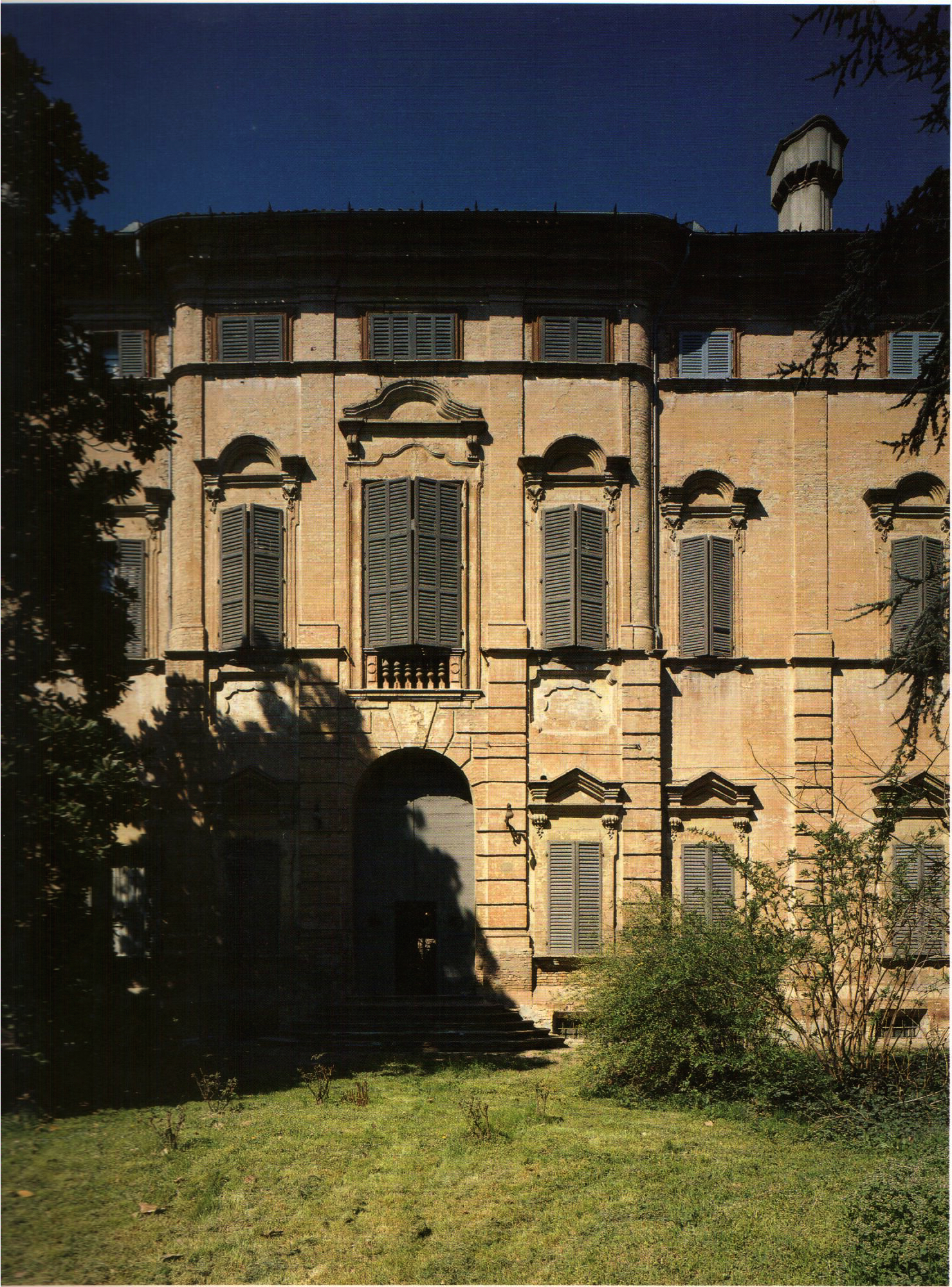 È certamente uno dei complessi architettonici più interessanti della Bassa modenese, dove le principali residenze urbane e suburbane mostrano sovente un gusto piuttosto sobrio nell’uso delle partiture decorative sui prospetti, preferendo proiettare all’interno le aspirazioni ad una dimora di rappresentanza. Il fronte un tempo scenograficamente affacciato sul corso del vecchio Cavamento dal quale era possibile ammirare la lunga teoria di residenze nobiliari che tra il XVIII e il XIX sec. qui vennero ad attestarsi (e in larga parte compromesse dal sisma del 2012), è ripartito da una griglia di paraste e cornici marcapiano su cui si innesta la duplice sequenza delle aperture finestrate al piano terreno e piano nobile, enfatizzate da eleganti coronamenti a timpano ed a lunetta, poggianti su peducci lavorati a riccio e a foglia d’acanto. Al plastico movimento della facciata principale, si contrappone il severo e scarno prospetto verso i giardini: un ampio spazio con serre ed edifici rustici con accesso secondario da Corso Giacomo Matteotti. All’interno l’organizzazione degli spazi si articola in ampie sale di rappresentanza, dove la decorazione era affidata soprattutto agli stucchi in forma di volute e motivi floreali. Un importante scalone a tre rampe, originariamente scandito da un incedere di statue, porta al piano nobile.