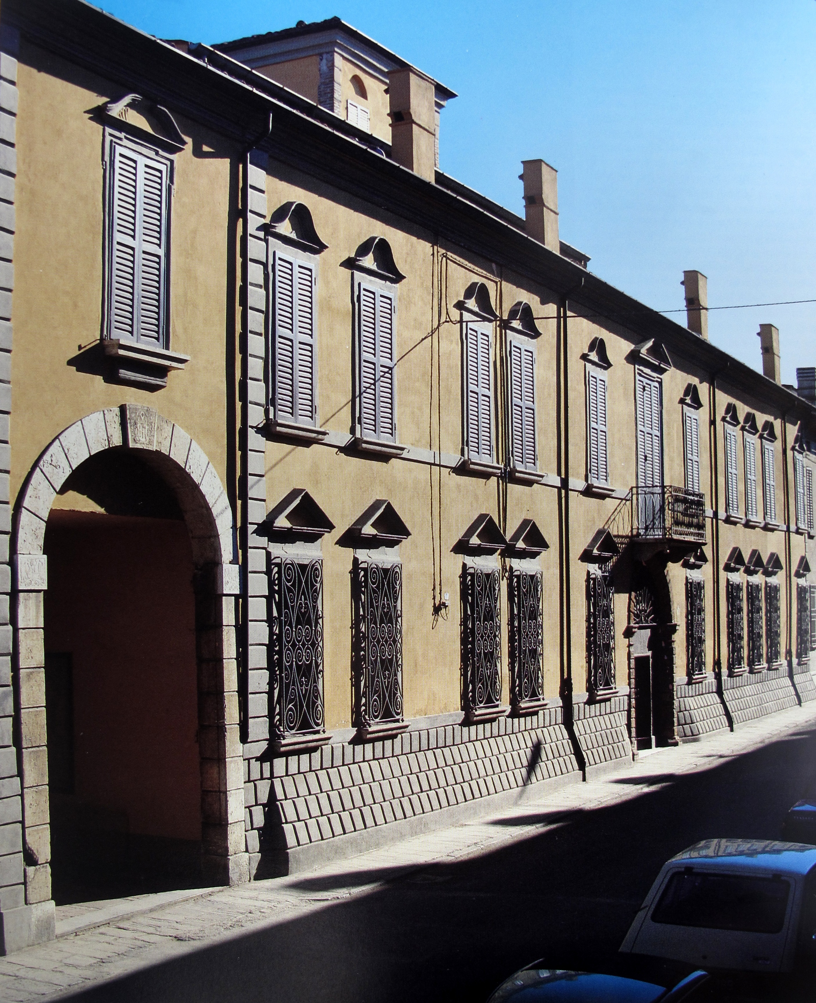 L’edificio della fine del ‘700 fu costruito sull’area di due edifici preesistenti; era costituito da un corpo principale con entrata sulla Via Nuova (Corso Cavour) e una entrata di servizio, al lato opposto, sull’attuale Corso Matteotti. Il corpo principale è formato da tre piani ed è unito, sul lato sud a edifici di servizio come scuderie, legnaie, lavanderie e rimesse, tutte raccolte attorno a un giardino interno.