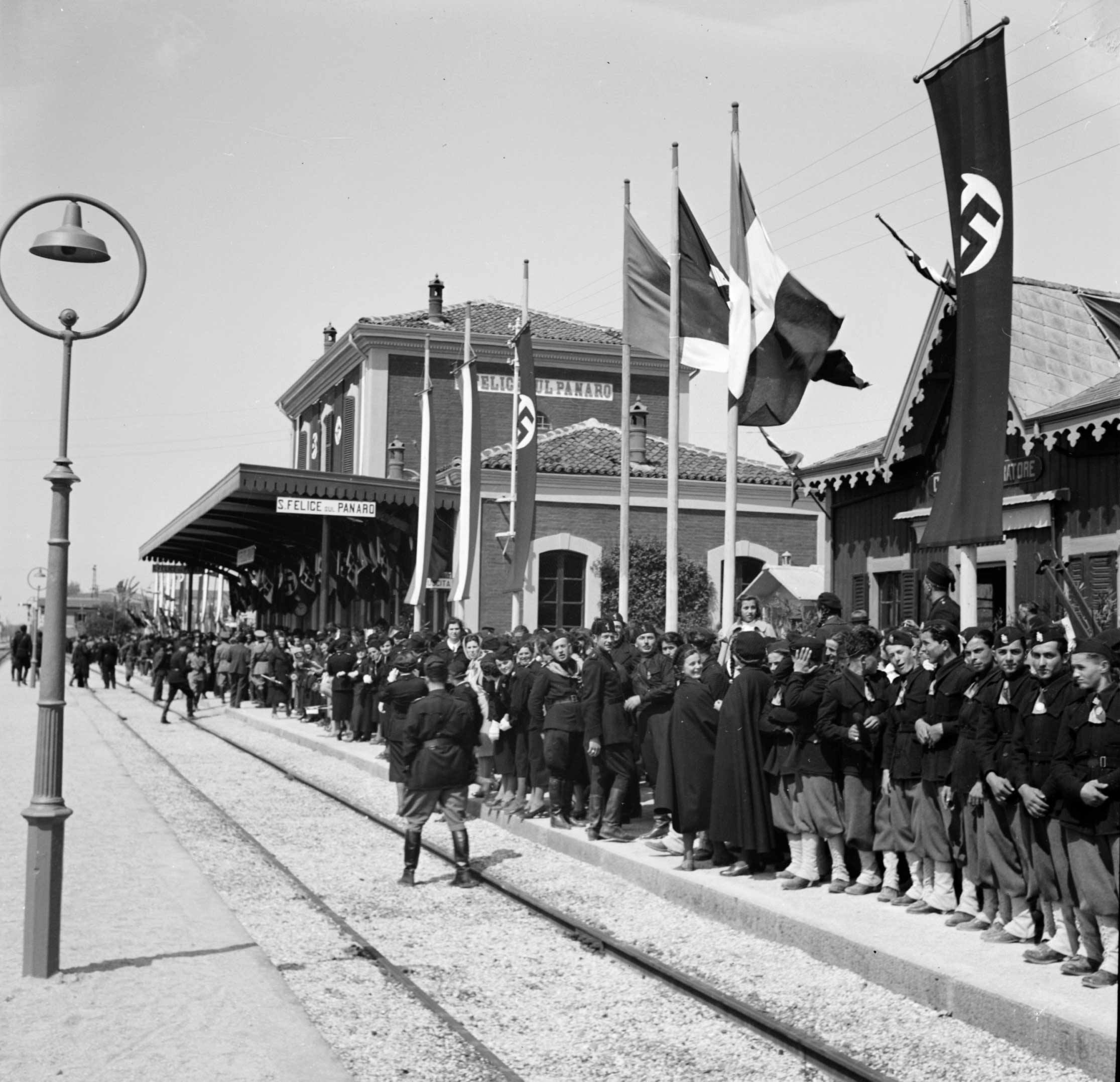 A Mirandola e San Felice il treno rallentò e il Führer, davanti a folle rigidamente inquadrate,salutò con il braccio alzato e proseguì.