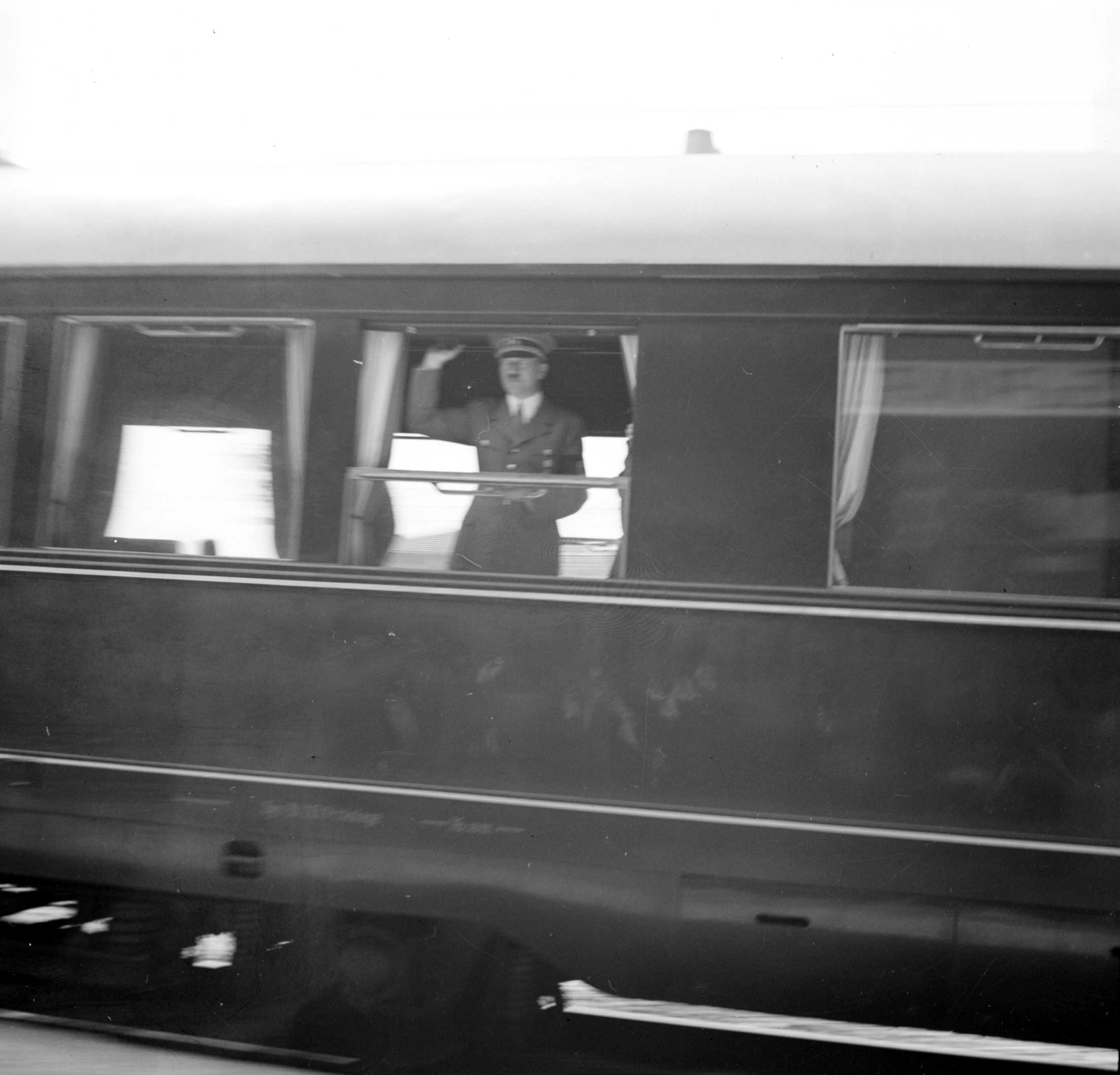 Il treno di Hitler (preceduto e seguito da altri due convogli) entrò in stazione alle 13.28 “precise”, rallentando notevolmente, accolto dagli inni nazionali italiano e tedesco. Il Führer, che secondo la Gazzetta non si aspettava forse tanti onori, si sporse dal finestrino di una carrozza centralesalutando “romanamente”.