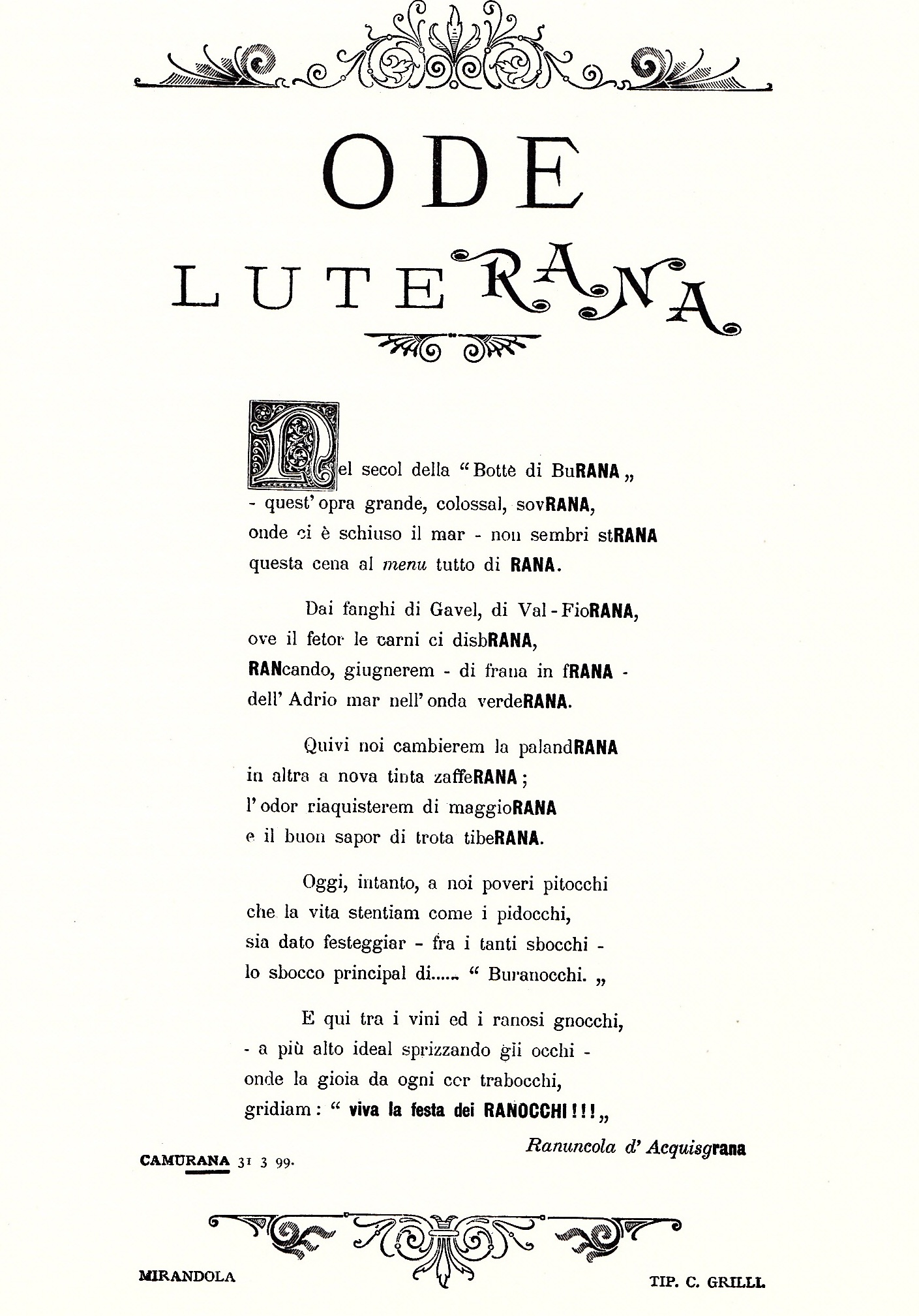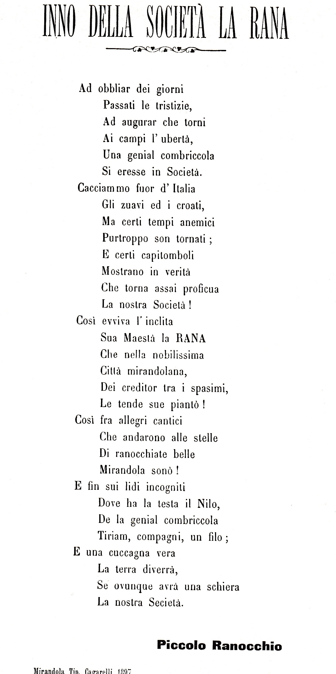 Detti ranari si erano costituiti in Società eleggendo quale loro Presidente il Signor Guido Magnanini e che ogni anno al tempo di Carnevale si radunavano in convito mangiando un boccone in allegria, confezionato a base delle rane e bagnato da un buon bicchiere di vino il quale dava a tutti la possibilità di parlare del loro umile mestiere.