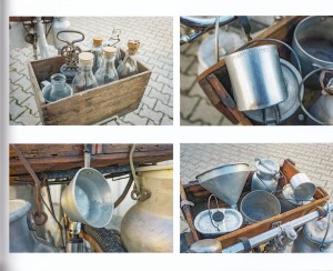 Nella cassetta posteriore si più ammirare una curiosità, un introvabile frullino a manovella in legno e ferro, la Zanglà, che il lattaio utilizzava per trasformare il latte invenduto in ricotta o in burro dalla panna. Le bottiglie di vetro sono invece successive a questo periodo, quelle che venivano fornite ai negozi ogni giorno con il latte fresco quando il lattaio in bici non c’era già più.