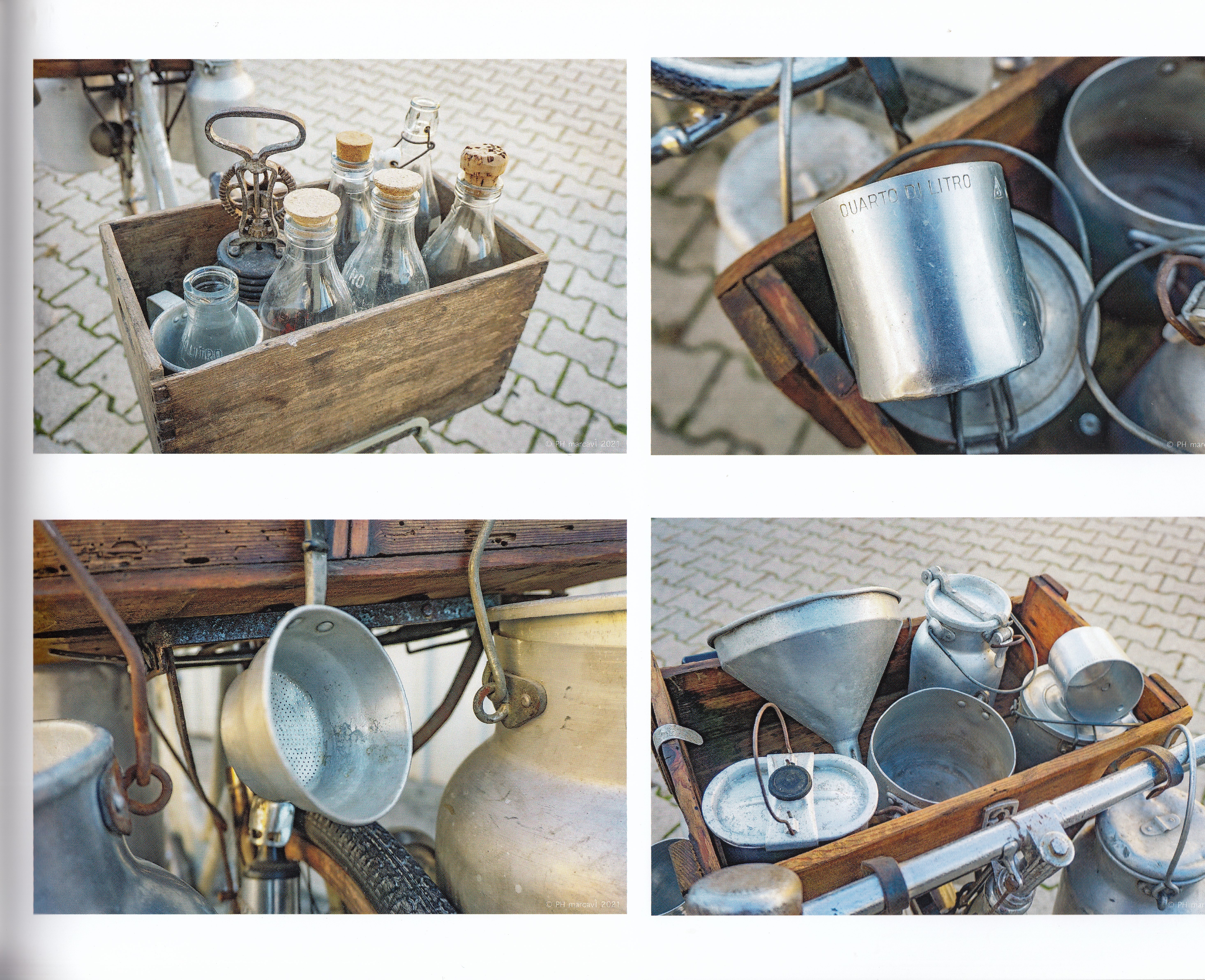 Sul manubrio, oltre agli enormi bidoni che dobbiamo immaginare pieni di latte per comprendere la fatica di quel mestiere, nella cassetta sono raccolti contenitori di quell’epoca, raminìñ in latta di ogni tipo dal più ricco al più umile. E non manca la trombetta, con un suono che ricorda quello conosciuto da Giorgio di tanti anni fa.