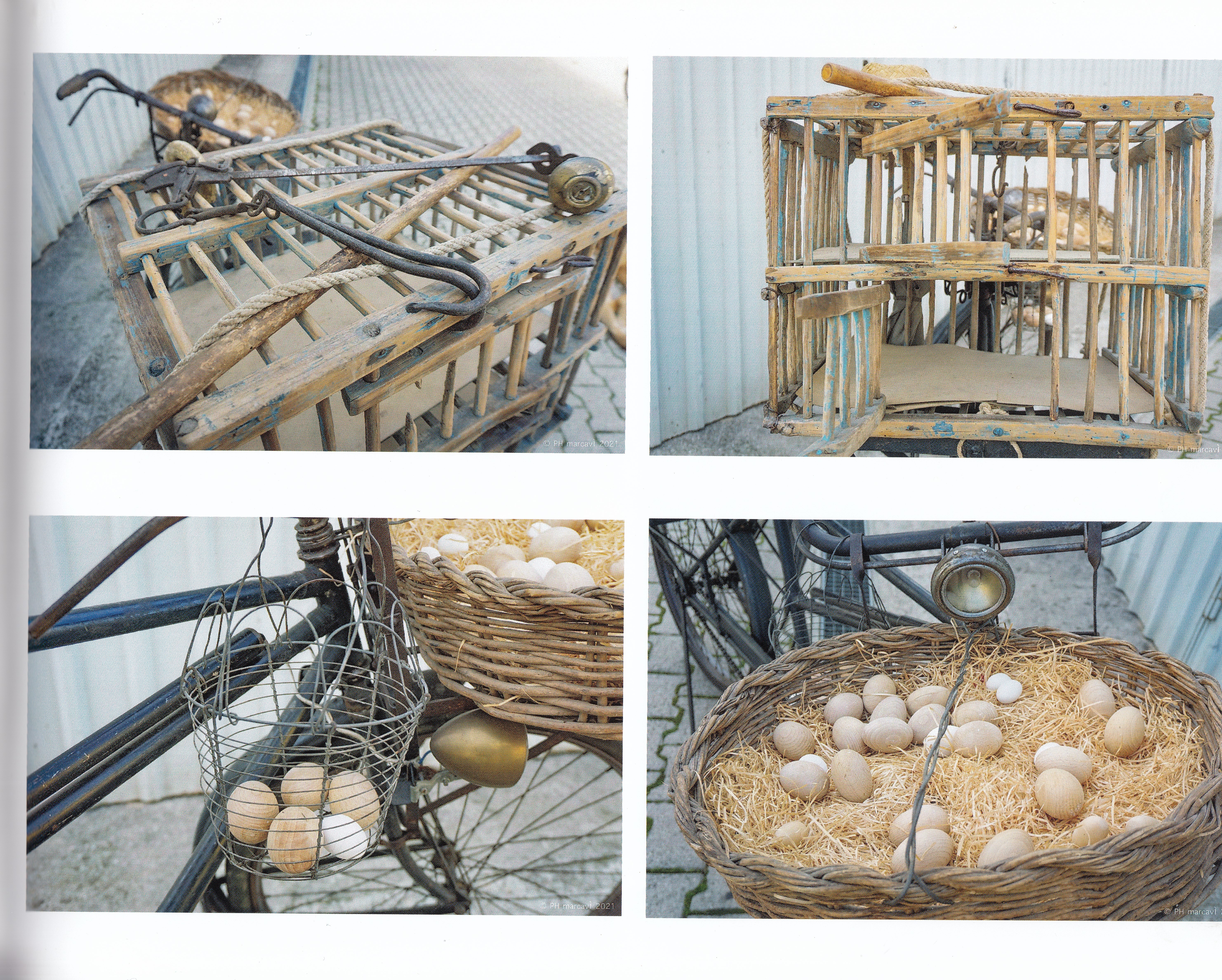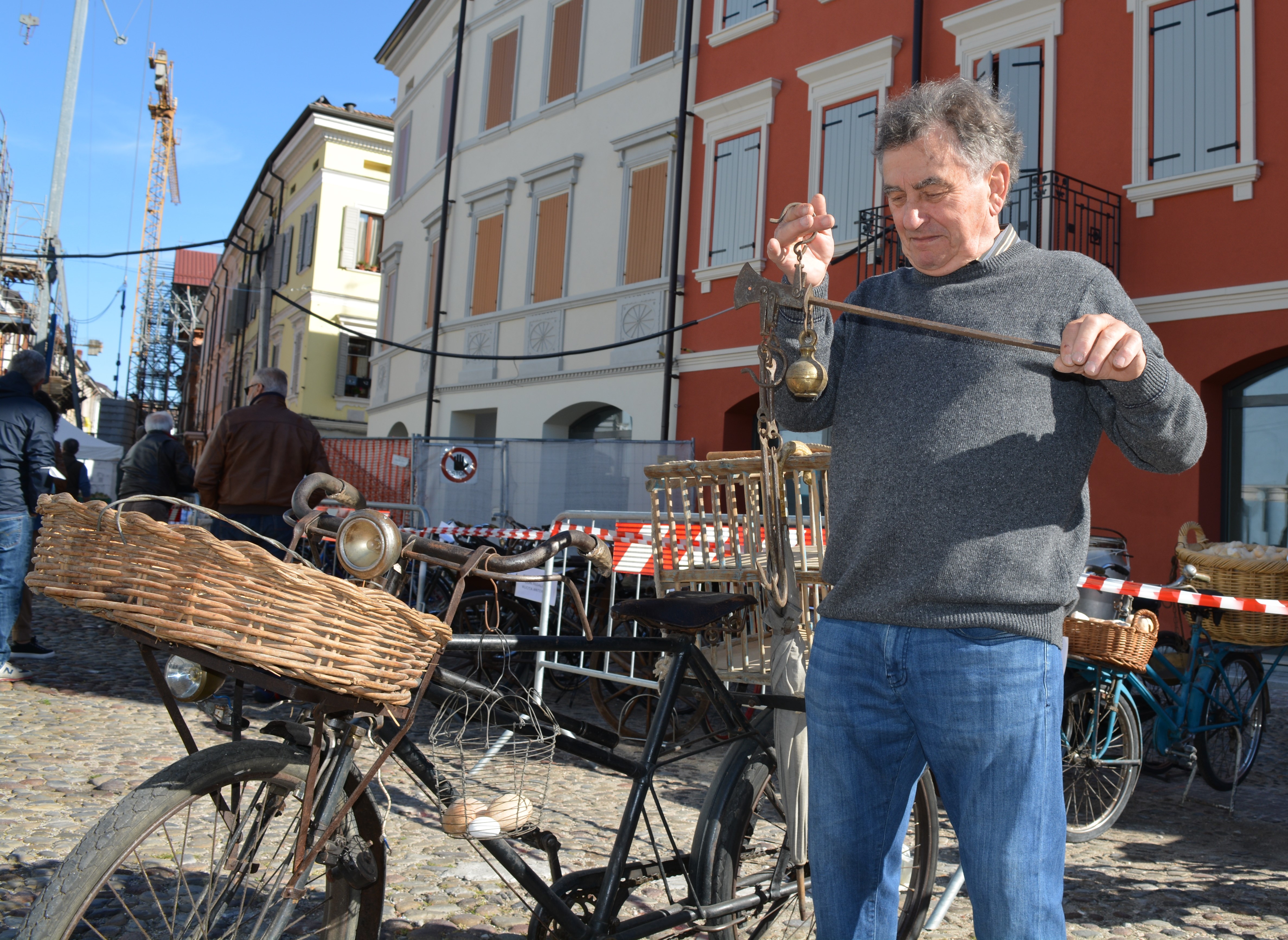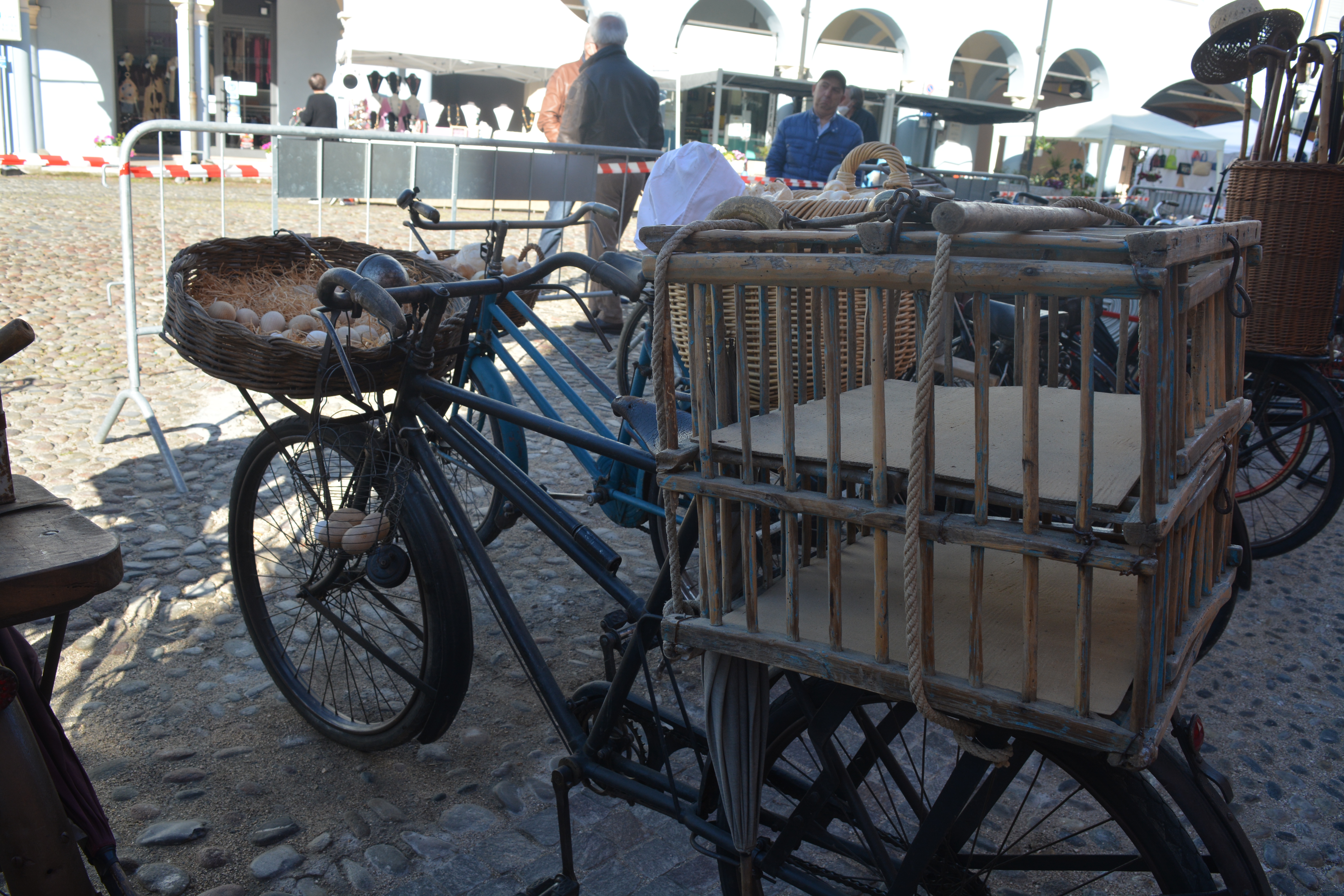 La cesta legata sul portapacchi posteriore è una gabbia in cui venivano stipati separatamente su due piani i conigli e le galline fino ai mercati, belli fiss. Quelli invenduti venivano “puliti” e preparati così per i negozi, a farlo c’erano intere famiglie che con quello ci ricavavano da vivere. La cesta anteriore era invece per le uova, con la paglia per evitare di farne delle frittate pedalando per gli sconnessi caradòñ. Un secondo piccolo cestino di metallo appeso al manubrio serviva quando ci si recava nelle case contadine come primo pratico contenitore delle uova, per poi trasferirle nella cesta tornati alla bicicletta, era lo stesso cestino che si utilizzava anche per lavare l’insalata, chiudendo le anelle superiori e facendolo scuotere velocemente per eliminare l’acqua.