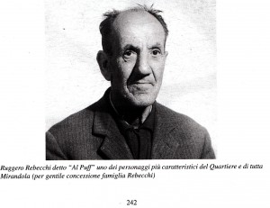 Forse il più caratteristico di tutti i personaggi locali fu certamente Ruggero Rebecchi detto “Al Puff” .Di mestiere faceva l’elettricista, ma non ha mai operato nel settore. Era, invece, suonatore di chitarrina che strimpellava alla meglio. La cosa migliore che egli riusciva a fare era quella di bere,( assiduo cliente del Borreghino ) e, tutte le sere, ritornava a casa ubriaco e poi picchiava la moglie. Si ricorda che molto spesso interveniva la polizia a sedare la solita lite. Balbettava e costantemente ubriaco non si capiva mai quello che diceva. Ma era benvoluto da tutti, bastava che non suonasse che già gli offrivano da bere. Abitava nel cosiddetto “casarmon” ed era fratello del “Mao” altro tipico personaggio amante del buon vino.