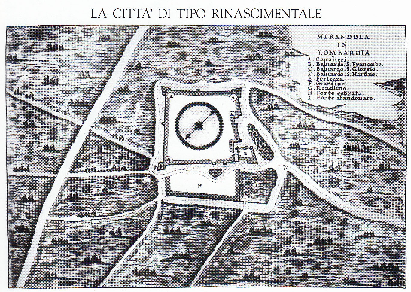 La prima idea fu semplicemente di fare una città; dal gruppo di case preesistenti; allargare e risistemare la Mirandola «prendendo dentro» quelle costruzioni che si erano andate formando d’intorno al castello, indifese, o non bene difese ed organizzando il nuovo spazio con la costruzione di una serie di nuovi edifici nello stile e nel gusto dell’epoca in modo da adeguare la città al ruolo di capitale e all’importanza della Signoria (Città Rinascimentale). L’attenzione fu portata principalmente all’organismo edilizio che fu realizzato secondo uno schema precedentemente studiato: gli edifici preesistenti che «contavano»: case, chiese, palazzi, ecc. vennero inseriti nelle nuove progettazioni in modo da aversi un determinato reticolo planimetrico nel quale erano contemplati nuovi elementi architettonici (che contavano) case, palazzi, chiese, ecc. quasi sul tipo di un «quadro» o di una prospettiva pittorica o di una scena fissa di uno dei primi teatri coperti.
