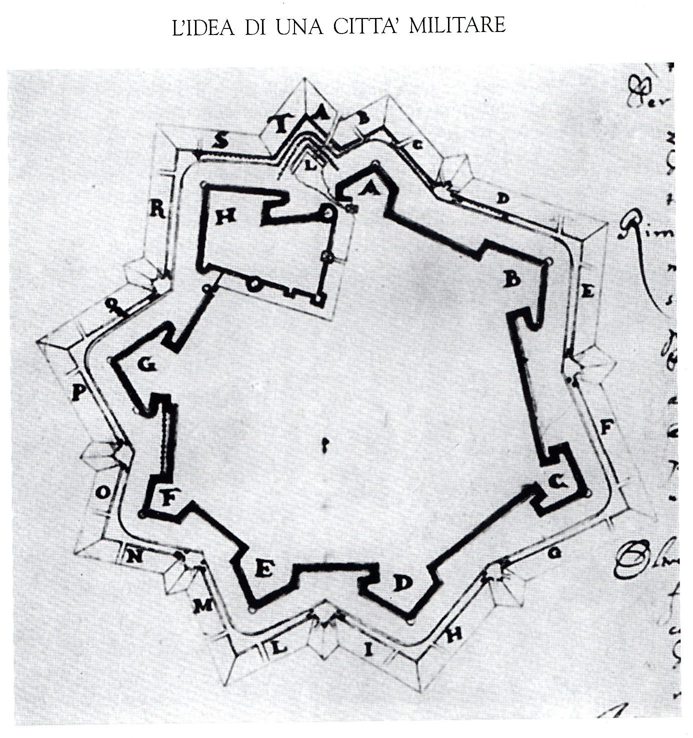 Il secondo perimetro completo della Città quale si ebbe circa dalla fine del secolo XVI (o dai primissimi del successivo) si sviluppava in pianta poligonale sullo schema delle città ipotizzate sulla base di posizioni culturali ed astratte, studiate e realizzate, quando lo furono, con dichiarati intenti militari. Infatti la cinta poligonale rispondeva in maniera ottimale alle esigenze e alle concezioni strategiche del tempo.