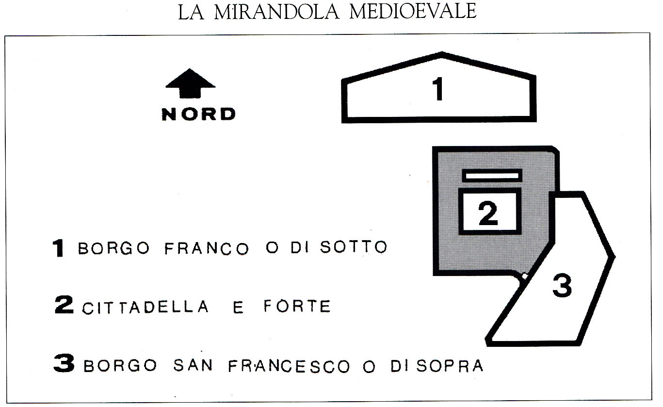 Il castello, dopo la ricostruzione del secolo XIV, era circondato da argini in terra e da un larghissimo fossato ma non era ancora «murato», e le case che costituivano la Mirandola si erano raggruppate spontaneamente intorno a due punti principali rappresentati dall’antica chiesa di S.Giustina a nord-ovest delle fosse e dalla chiesa vecchia di S. Francesco verso levante e mezzodì, costituendo due grosse borgate che si chiamarono, anche dopo la modificazione di questo stato di cose, Borgo di Sotto e di Sopra.