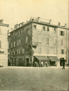 Si immagini il resto della Piazza: un grande rettangolo, chiuso a ponente dopo il Bergomi da un prato, poi dalle fosse e dagli argini, dalle cortine e dalle torri del Castello; a nord dalle opere della Porta sormontata da una torre (la Madonnina allora non era ancora stata costruita); a levante dalla fila delle case di altezze disuguali, colle loro facciate in cotto e dei palazzi coi loro portici e loro botteghe (dei ramari, che «battevano» e facevano oggetti di rame, degli ortolani, dei conciatori e sellai, dei bottai, ecc.), il voltone cioè l’ingresso della strada del Ghetto; una città umana, fatta per l’uomo, secondo le proporzioni e la misura dell’uomo.
