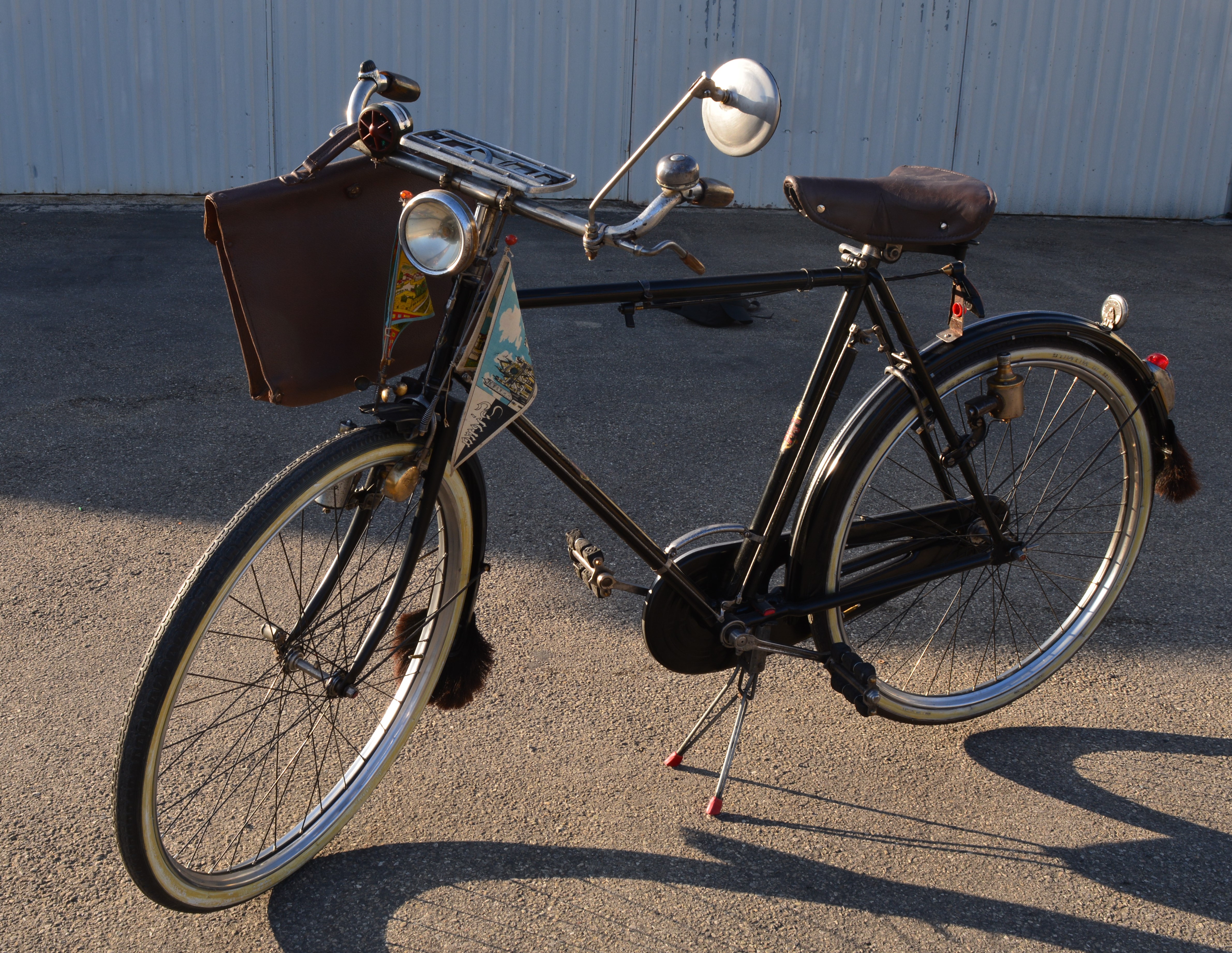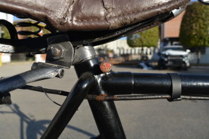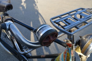 Una leva posta sotto la canna orizzontale muove una freccia sotto la sella ad indicare la svolta a destra o a sinistra, illuminata da una lampadina alimentata da una delle due dinamo, due per le molte luci sulla bicicletta, una dinamo solo per il bel fanale Bosh anteriore, tondo, enorme. Non è di marca Àncora perché come tutti i costruttori di quel tempo anche l’Àncora forniva le bici senza i fanali e la dinamo che venivano aggiunti a richiesta alla messa su strada da un meccanico.
