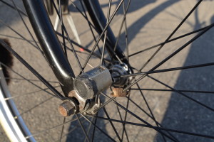 Oltre al gommino sul manubrio per appoggiarla al muro la bicicletta possiede anche un secondo gommino sulla sommità di una leva sotto la sella, in modo da distanziare completamente il telaio dal muro. Tra le due canne verticali del telaio vi è infine una maniglia che consente di sollevare agevolmente la bici per fare scale o superare ostacoli, la maniglia saltafosso (che una volta scoperta ho adottato anche sulla mia bici e vi garantisco essere di grande utilità).