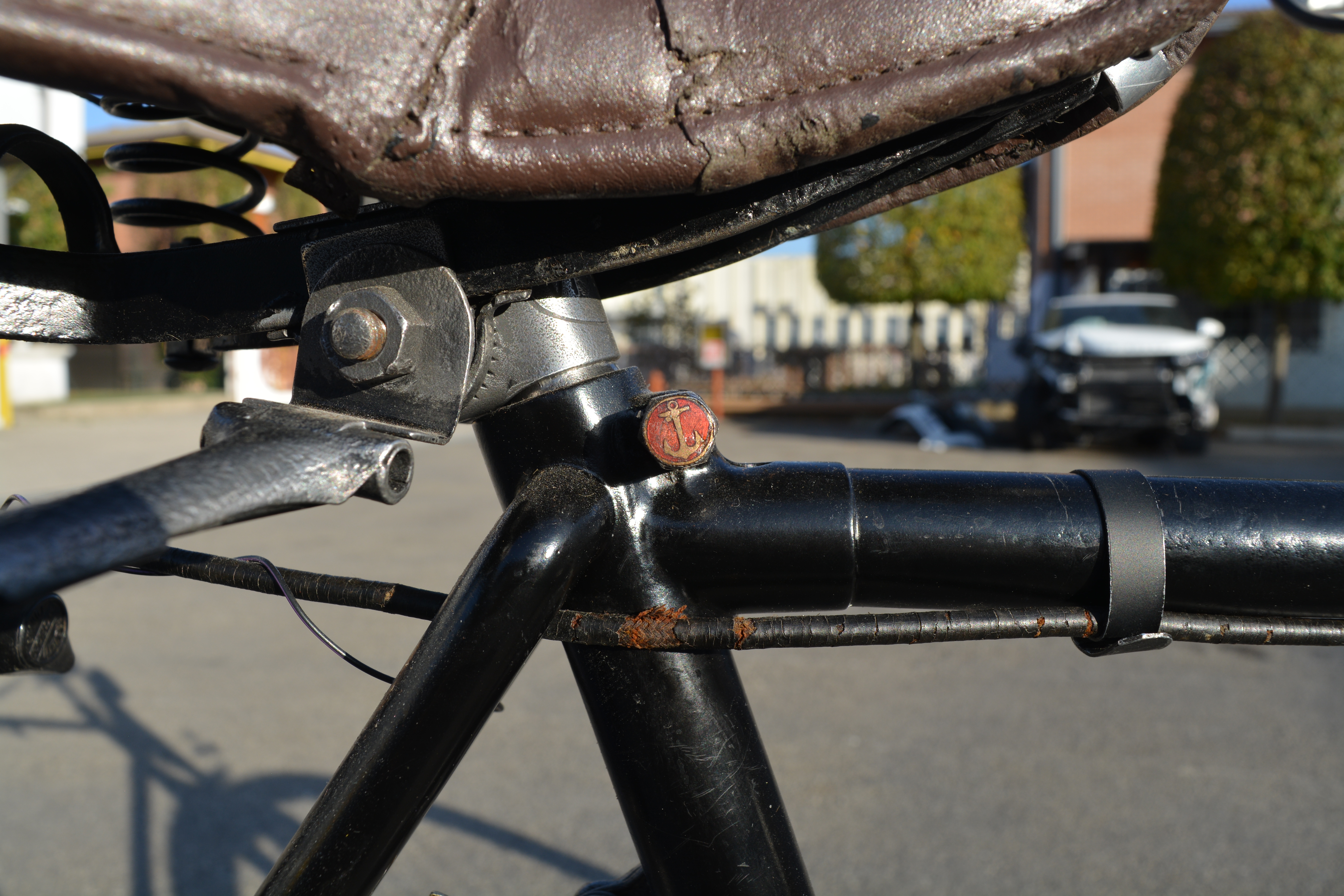 La bici è una Àncora, una bici prestigiosa con una ciclistica eccellente, a livello delle migliori marche, fondata da due ex campioni di bici. Andati in difficoltà con la crisi che ha seguito la fine della Grande Guerra l’azienda è stata acquisita dalla Dei che ha continuato a produrre con questo marchio fino proprio al 1939. Un bel disegno a forma di àncora è impresso su ogni bullone, mozzo, pedale, freno, stemmi sono anche sulla canna, sulla sella, sul manubrio, persino l’ingranaggio centrale della leva di trasmissione del freno posteriore è a forma di àncora. Una balloncino, una bici da uomo ma con le ruote del 26 da donna, con un copertone però più largo, bombato.
