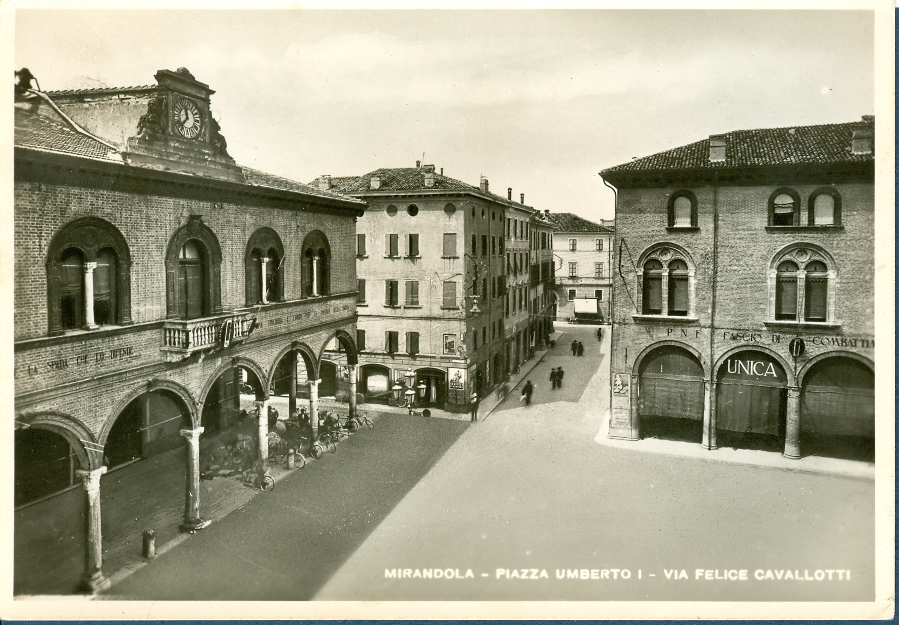 Mi era capitato, per la verità rare volte, che dopo un temporale estivo, la facciata settentrionale del palazzo comunale apparisse abbondantemente bagnata dalla pioggia scrosciante. Sulla stessa facciata, prima che si asciugasse alla calura estiva, apparivano come ombre inscurite dall’umidità, le lettere, in caratteri maiuscoli, di una scritta. Non era possibile decifrare la scritta nel suo insieme, ma risultavano comprensibili molte lettere di ogni singola parola. Chiesi pertanto a un anziano della squadra operai se lui avesse mai visto la scritta e cosa essa rappresentasse. Il caposquadra Dario Pozzetti (1921-1986)[1] mi informò che l’epigrafe si riferiva ad una frase pronunciata da Benito Mussolini (anno 1938) ed esattamente: «È l’aratro che traccia il solco ma è la spada che lo difende.» Nello scorrere le cartoline ho trovato l’immagine esatta della scritta con una particolarità. Risulta possibile leggere il testo originale solo per la parte sopra riportata, che si colloca alla sinistra, per chi guarda, del balcone posto al centro della facciata. Ma sulla destra del balcone compare un’altra scritta, illeggibile sulle cartoline. Incuriosito ho effettuato una ricerca che mi ha consentito di completare l’intero motto mussoliniano, ovvero: «È l’aratro che traccia il solco ma è la spada che lo difende. E il vomere e la lama sono entrambi di acciaio temprato come la fede dei nostri cuori». Tuttavia non ho certezze che la seconda parte della frase sia effettivamente quella riportata nell’epigrafe mirandolese. Evidentemente la scritta è stata cancellata o abrasa nel corso del 1945.