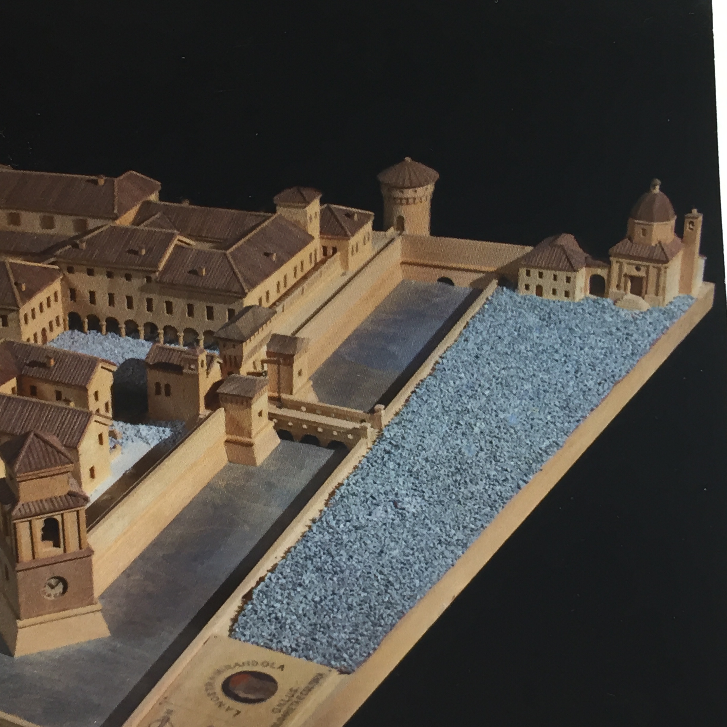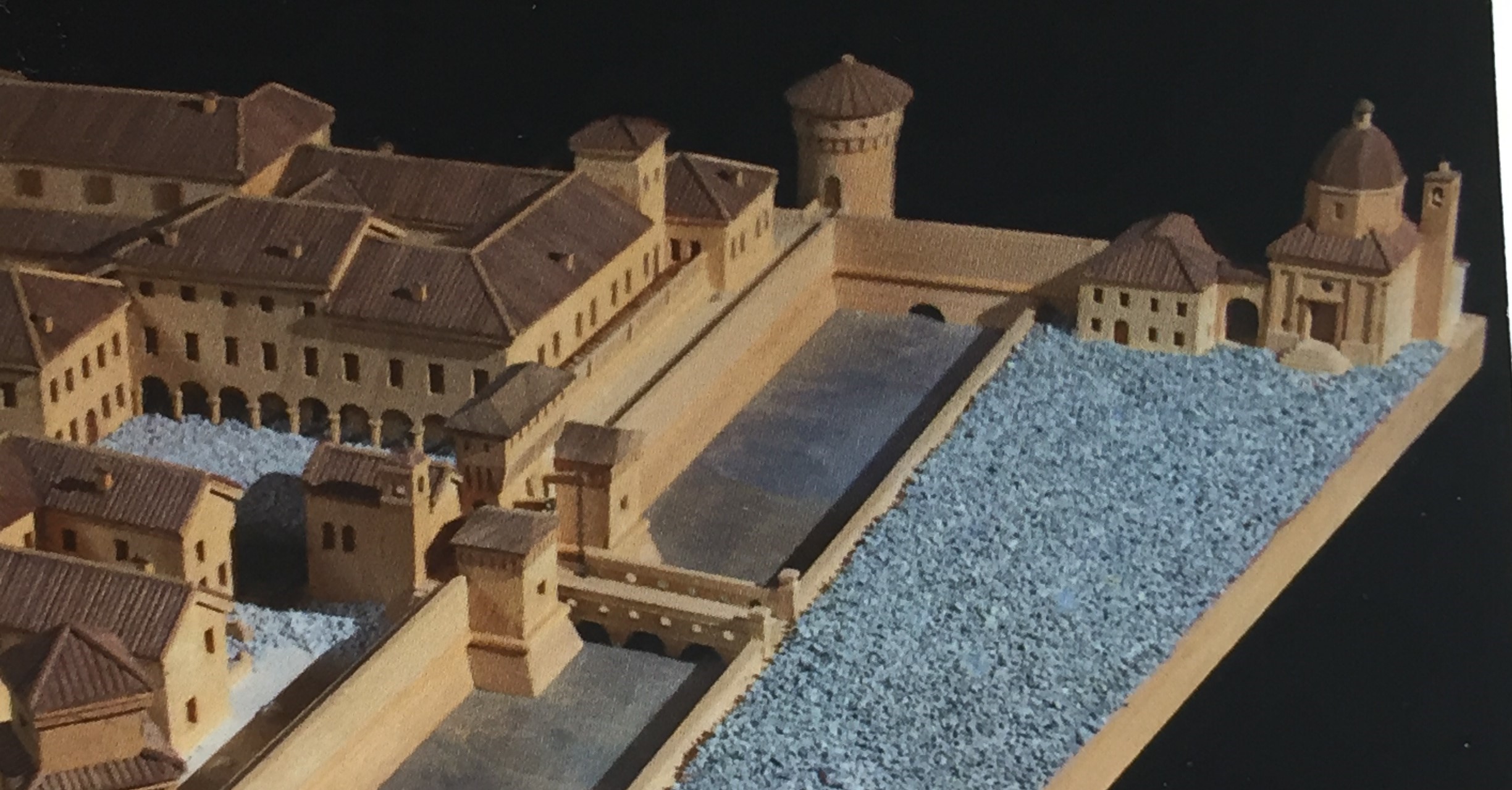 Foto n 2: Castello dei Pico, così come compare dai disegni di Giacinto Paltrinieri, sec. XIX. Particolare del modello in legno di Nino Braga (1940-2014), che a Santa Caterina di Concordia si è dedicato, con passione e capacità, alla riproduzione in miniatura di capolavori della architettura italiana. Si riconoscono, nel lato settentrionale, l’Oratorio della Madonnina, il voltone di porta Mantova, il fabbricato sede del corpo di guardia per il controllo dell’accesso alla città, il fossato con la sua chiavica e il muro di cinta, la torre della Maddalena. La torre controllava il complesso dei ponti levatoi che conducevano a porta Mantova. Lo scavo del 2020 ha intercettato la chiavica e una porzione del muro della torre circolare della Maddalena[1].