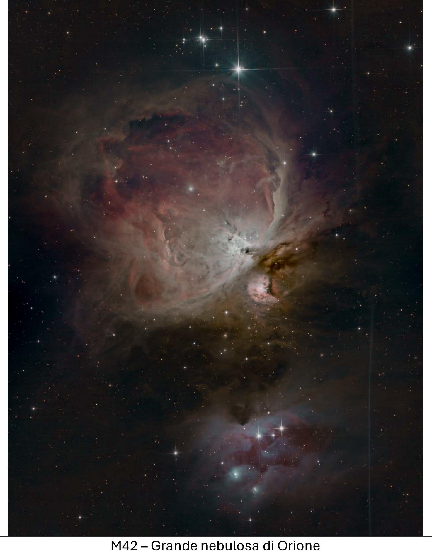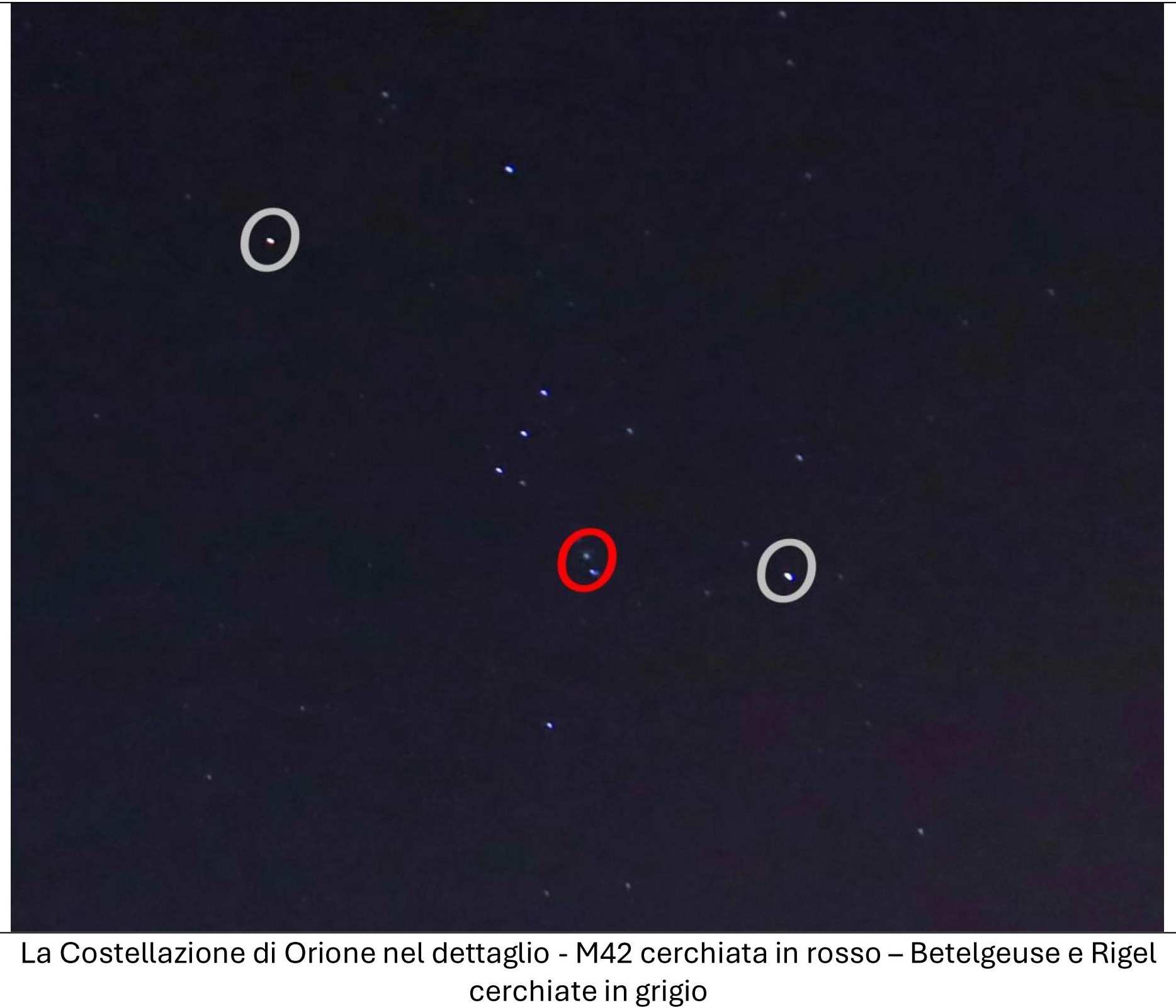 La piccola nebulosità visibile anche ad occhio nudo è la sua celebre “Grande Nebulosa di Orione” conosciuta anche come M42.