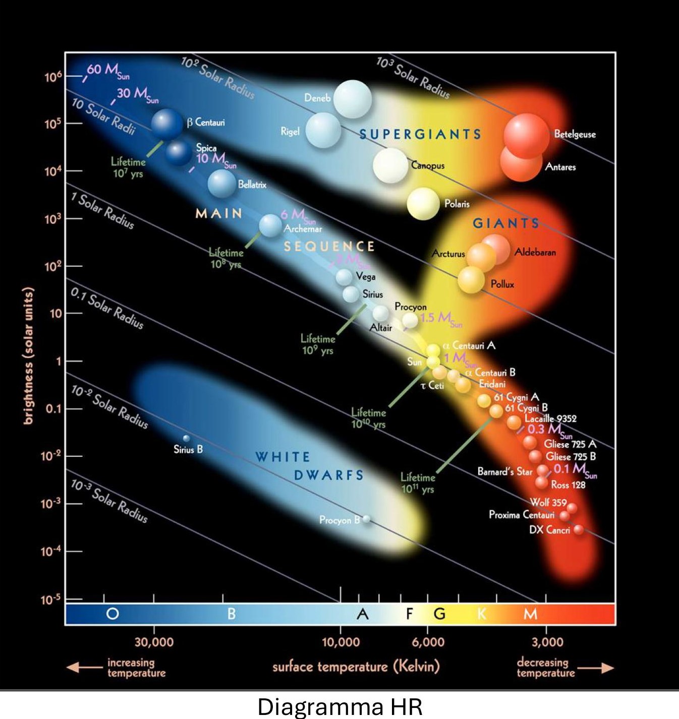 Prima però di partire per questo breve viaggio ripassiamo cosa sono le stelle di tipo Wolf-Rayet (per gli amici WR) e per farlo riprendiamo a mano il diagramma HR, quel diagramma in cui si mette in relazione la luminosità (magnitudine) e la temperatura di una stella: le nostre amiche WR si trovano nella parte alta e sinistra del diagramma, nella zona delle SUPERGIGANTI AZZURRE.