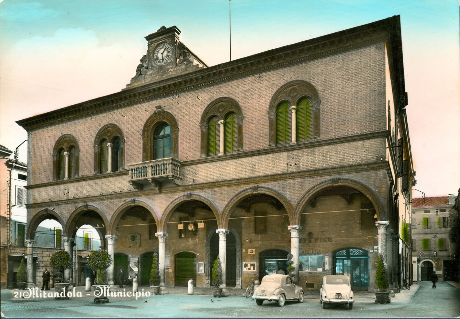 La parte frontale, quella col porticato che guarda la piazza e sovrastata da un salone che corre per tutta la sua lunghezza, viene costruita nel 1468 per volere di Giovan Francesco I (ma realizzata dai suoi successori) aggiungendola ad un edificio preesistente di cui si sa solo che esisteva già alla fine del XIV secolo. La parte posteriore , che dà sull’odierna piazza Mazzini, venne invece aggiunta nel 1748. La facciata anteriore è leggermente obliqua essendo rivolta lievemente verso il castello e non perpendicolare alla piazza. All’interno di alcune colonne del porticato anteriore sono scavate le impronte delle antiche unità di misura in uso nello Stato della Mirandola: la pertica, il braccio e il piede mirandolesi. In una nicchia sotto il porticato frontale, ora non più esistente, venne posta la statua della Madonna coronata col Bimbo protettrice del popolo, detta “Madonna della Piazza”. La statua, che ora si trova sull’Oratorio della Madonnina, fu tolta nel 1798 e messa provvisoriamente in Duomo. La nicchia venne chiusa agli inizi del XIX secolo quando la facciata venne restaurata per prendere poi la forma presente nel 1905. Nel 1837 venne aggiunto l’orologio, che da allora scandisce la vita dei mirandolesi coi suoi rintocchi. Ecco parchè ariv sempar in ritard……………