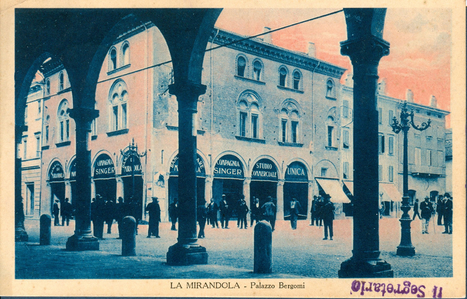 Il palazzo ora detto Bergomi, antica casa dei Bufali, è più o meno contemporaneo della facciata del Palazzo Ducale. Probabilmente è rimasto incompiuto; infatti la facciata che dà sulla piazza, che originariamente era l’unica ad avere i portici, sembra terminare alla fine della quinta campata in modo un po’ incongruo. Ad un certo punto, in pieno periodo di decadenza della città, i portici vennero chiusi per poi essere riaperti nel 1922. E tant chi gh’eran ian avert anc quei ad banda, in via Cavallotti. Tò mo.