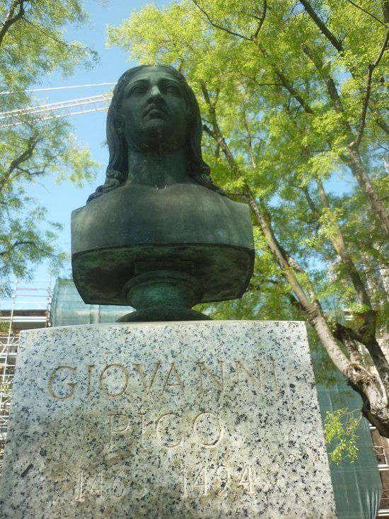 A breve distanza sulla piazza, il monumento a Giovanni Pico, eretto nel 1963 e opera dello scultore modenese Vittorio Magelli. Il monumento porta quattro medaglioni raffiguranti Savonarola, il filosofo Marsilio Ficino, il letterato Angelo Poliziano e Lorenzo il Magnifico.