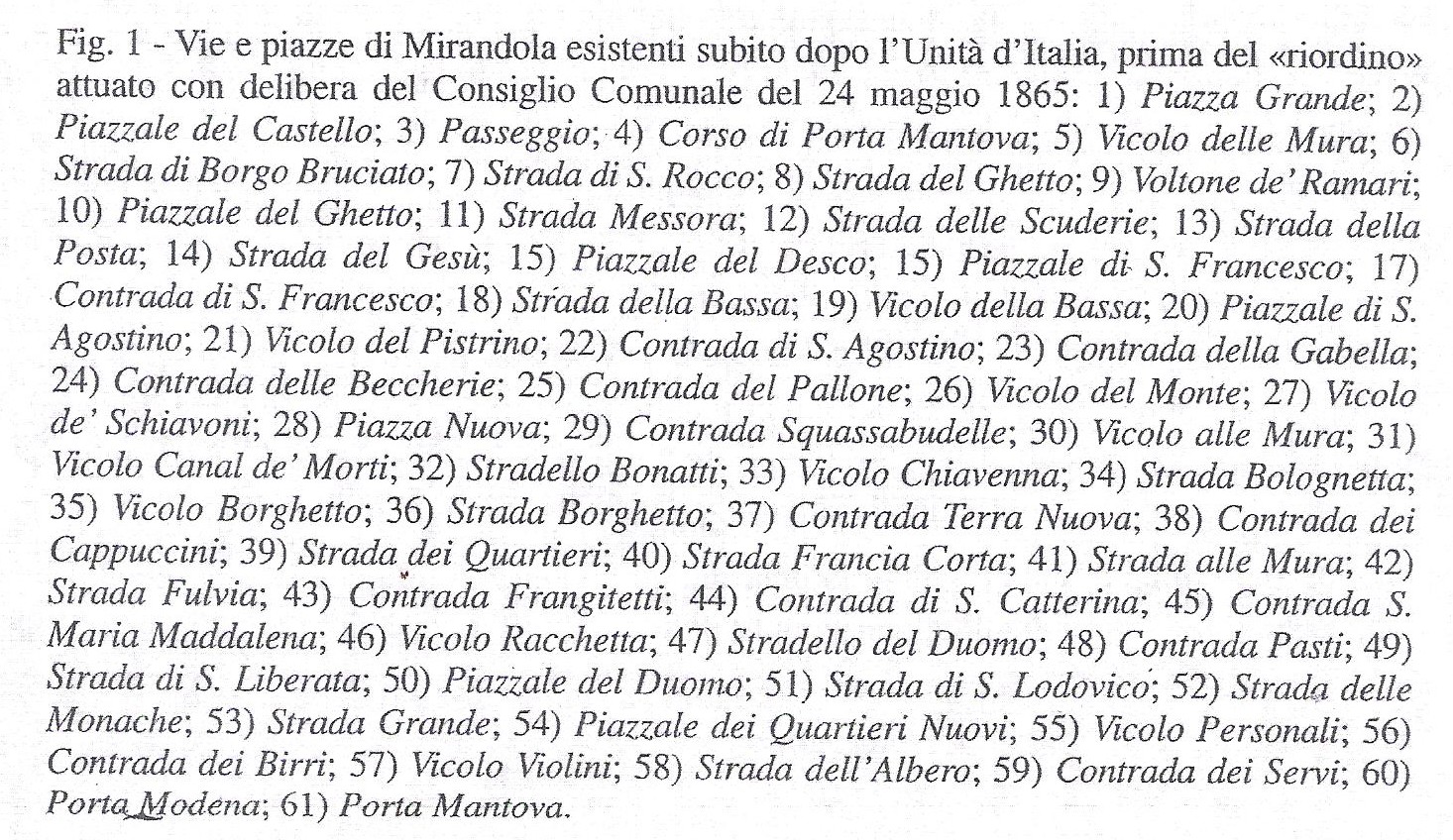 A parte la leggenda che ben conosciamo, le origini di Mirandola si fanno risalire, più o meno, quasi, pare, sembra, all’incirca, suppergiù, approssimativamente verso la fine dell’XI secolo quando per la prima volta vi è la notizia “locus qui dicitur Mirandula”.Questa è la versione ufficiale degli storici seri; circola invece la voce che un viandante di vaghe origini spagnole che passava chiese ad un villico: Orsù signore mi ragguagli, com’è menzionato codesto mirabile luogo? Il villico rispose: Guarda là. Ed indicò un cartello col nome del luogo. Ma il viandante essendo miope non lo vide ed esclamò: Ah, mirando là!
