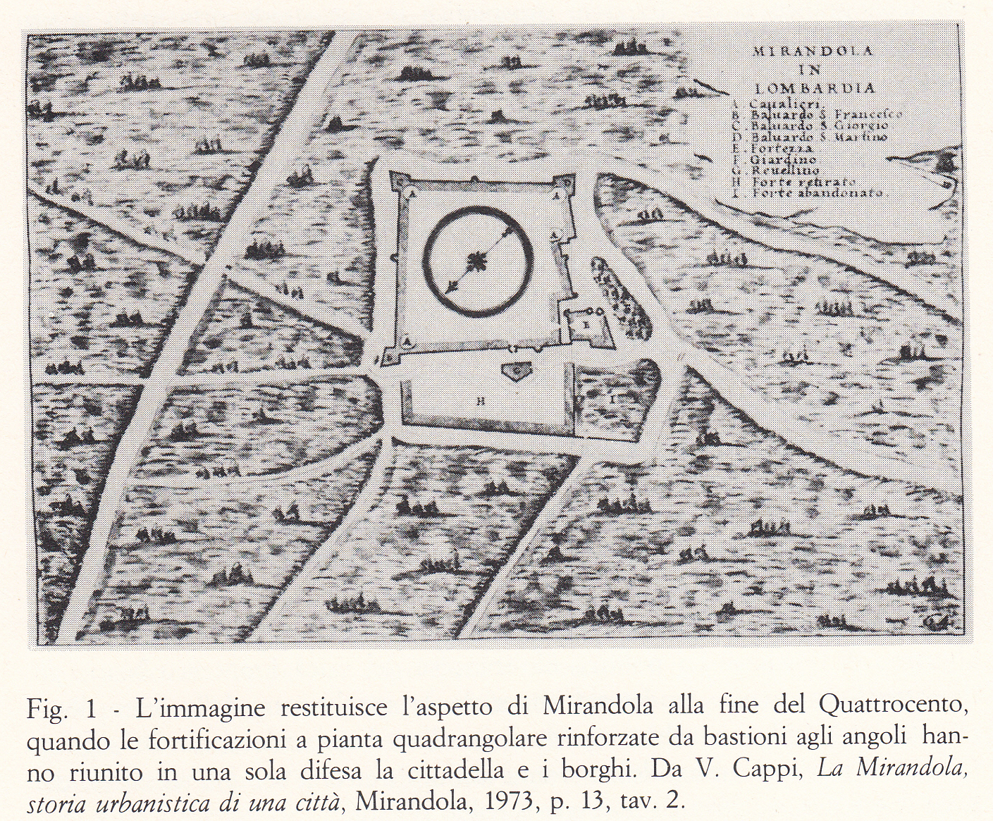 [*] La scheda, che ha valore di sintesi per una lettura del centro storico di Mirandola, attraverso le trasformazioni subite nel tempo, da castello, città rinascimentale e fortezza, era stata scritta per la mostra «Paesaggio, immagine e realtà», sezione «Il Paesaggio della Pianura Padana», organizzata nel 1981 dalla Galleria di Arte Moderna di Bologna. Per ragioni organizzative Mirandola non figurò alla mostra, ma soltanto il saggio su Finale Emilia, anch’esso steso da chi scrive. Il testo è riproposto in questa occasione, precisando che la bibliografia è soltanto indicativa e aggiornata al 1981 e che si è debitori nella stesura allo studio di V. Cappi, La Mirandola, storia urbanistica di una città, Mirandola 1973.