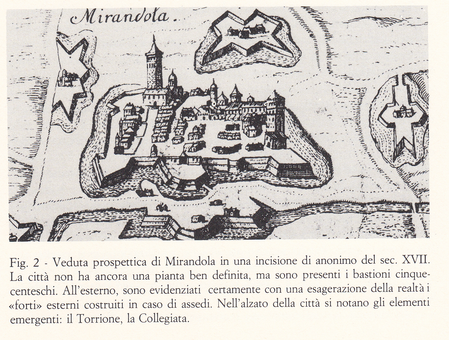 Le fortificazioni a pianta stellare, tipiche delle piazzeforti della matura epoca cinquecentesca, dando fama di fortezza imprendibile a Mirandola, contribuirono a renderne noto l’aspetto attraverso la divulgazione di incisioni particolarmente diffuse tra la fine del XVII secolo e il XVIII.