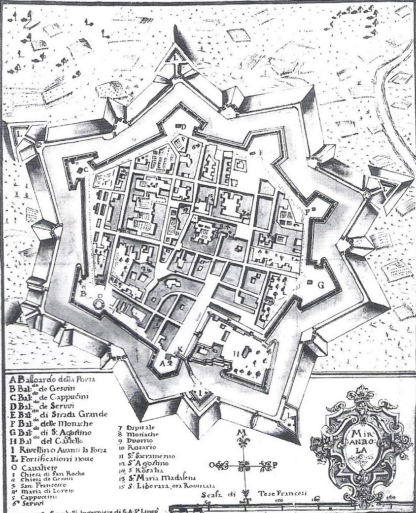Dopo l’assedio del 1510-11 di Papa Giulio II, assedio vittorioso grazie al freddo eccezionale che congelò l’acqua del fossato, i Pico iniziarono a rafforzare le difese perimetrali della città che in poco più di 50 anni portarono a mura possenti, munite di solidi bastioni dello spessore di 2-3 metri, e alla classica forma ottagonale che ancora oggi si può notare dall’andamento dei viali, sorti sul vecchio tracciato delle mura.