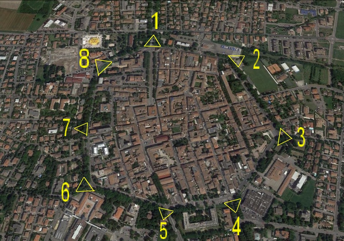 Nelle mura si apriva un’unica porta a nord, che venne chiamata Porta Mantova dopo l’apertura di una seconda a sud nel 1768, al termine dell’odierna via Roma, chiamata Porta Modena.