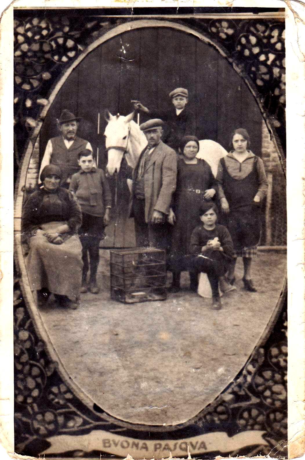 Nella foto la famiglia Bosi nella Pasqua del 1923 o 1924: al centro, con il cavallo, il cantore di zirudele Jusfin Bosi con la moglie Vittoria, a sx il capofamiglia Geminiano con la moglie Clerice poi i figli Gino, al centro sul cavallo Valter e le sorelle Dirce e Clelia
