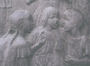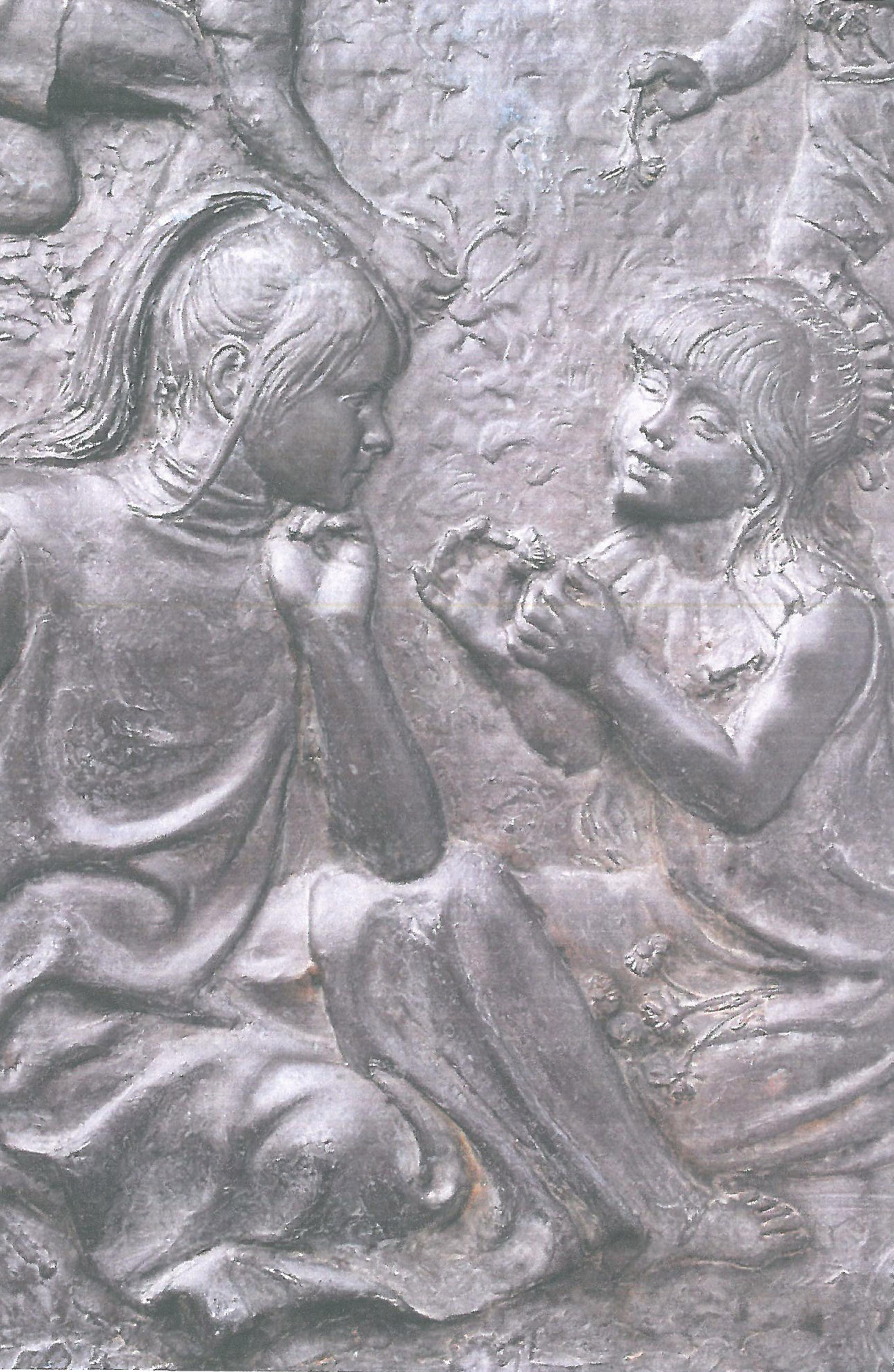 E’ la gente delle campagne che ispira le creazioni della ritrattistica, visi ed emozioni di grazia e purezza anche qui nelle 26 formelle del portale. Un confronto diretto lo si può fare con la sua scultura a tutto tondo di scena agreste in cui bambine corrono ma una di esse rimane impigliata nei rovi e l’amica cerca di aiutarla. Stessa umanità e sentimenti sono la linfa vitale delle formelle qui proposte, dove il tema è la gioia e la spensieratezza dei fanciulli trasfigurato in un canto di lode alla Madonna.