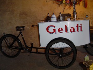 Enzo con un triciclo proprio come quello della foto (il  suo aveva in più, sul fronte, la testa di un’aquila scolpita, come una bolena di una nave) distribuiva gelati casa per casa, pedalando su strade “bianche” (strade ghiaiate e polverose) arrivando fino a Gavello Ferrarese ed a volte  anche a Burana dove aveva numerosi ed affezionati clienti.