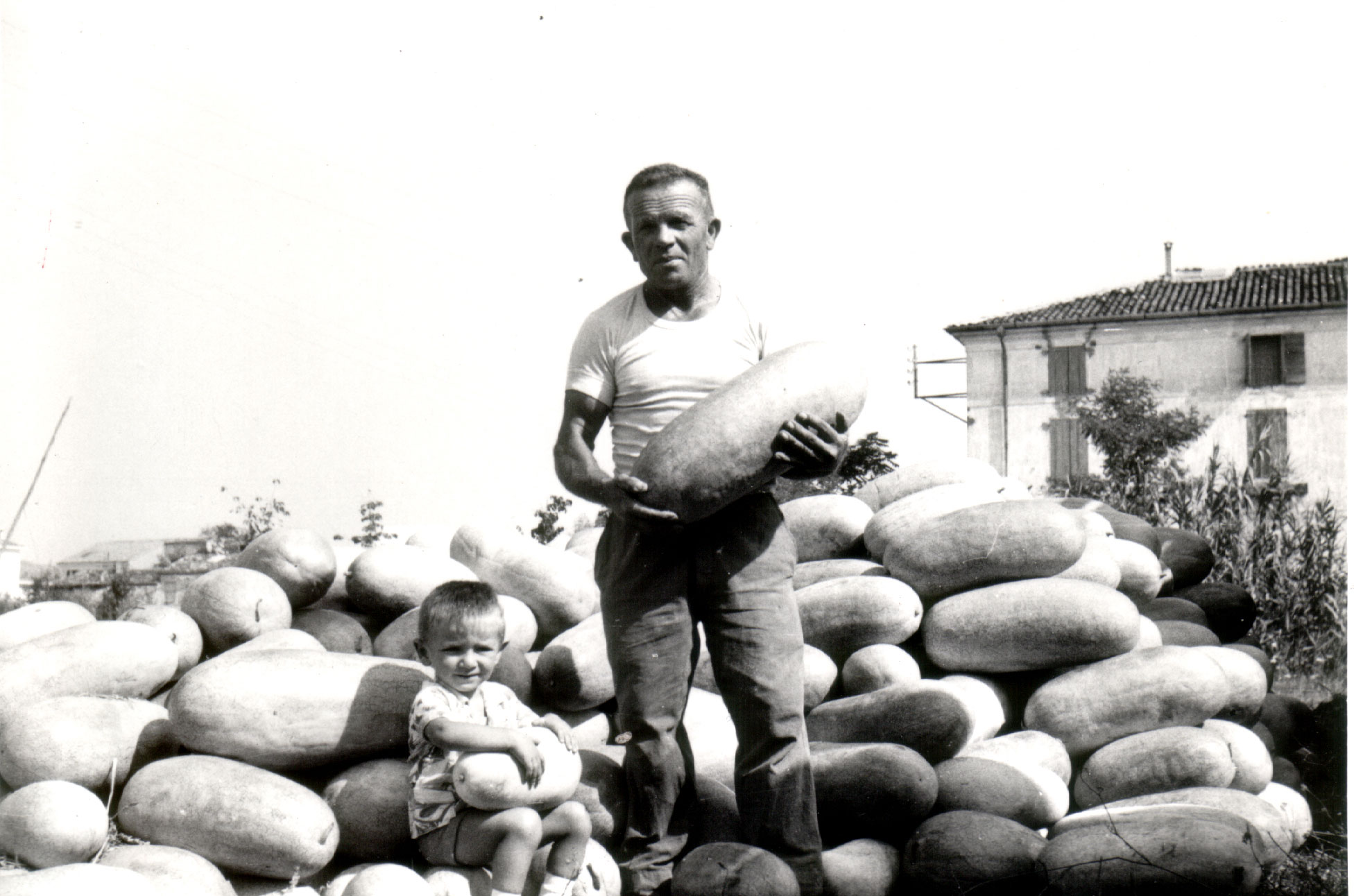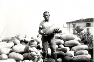 Al mlunar Galileo Reggiani con una dei suoi dolcissimi cocomeri “Charleston”, immortalato nella sua melonaia, oggi campo sportivo della Sanmartinese Calcio.