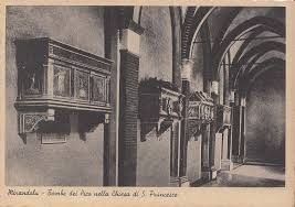 I Pico, particolarmente devoti al Santo di Assisi, elevarono l’edificio religioso a loro Pantheon; infatti all’interno della chiesa si trovavano diverse tombe e memorie funebri di personaggi della famiglia Pico, che negli ultimi tempi venivano inumati in un sepolcro comune del casato nella cripta, purtroppo distrutta e interrata intorno al 1922, della Cappella della Beata Vergine di Reggio. Rimangono invece le quattro tombe monumentali pensili realizzate in tempi più antichi.