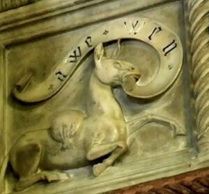 The first question to be answered is what animal it is, that is a zoological identification. Ceretti wrote that it was “a mule fallen to the ground”, a statement later repeated by Cappi. Assuming that it is rather difficult to distinguish whether a relief sculpture depicts a mule or a donkey, it is even more difficult, indeed impossible, to determinate its gender. Given the absence of proven historical sources, the issue must be assessed based on an iconographic and iconological research, that is the comparison with other images, the reference to textual sources and the symbolism. In religious contexts and medieval sacred art the donkey is much more frequently depicted than the mule due to reasons rooted in Holy Scriptures and Christian symbolism. The presence of the donkey was not accidental, but conveyed profound theological messages often at odds with its social perception. This animal was, in fact, a powerful symbol of Christian faith, representing humility and meekness. The most significant role of the donkey, much more central to the biblical narrative than one might imagine, is linked to various episodes in the life of Jesus, also depicted in the great fourteenth century masterpieces by artists such as Giotto, Duccio di Buoninsegna or Pietro Lorenzetti. The apocryphal gospels report that the Virgin Mary, expecting Jesus, was forced to travel to Bethlehem on the back of a donkey, with Joseph by her side, due to the census ordered by the Emperor Augustus.