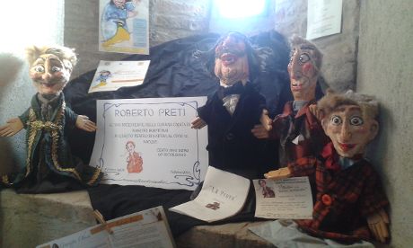 presso la Torre medievale dove in una sala al primo piano sono esposti fondali, scenografie e quinte di teatro che insieme a burattini, cartonati e materiale scenico del lascito danno vita ad ambientazioni tematiche riconducendo il visitatore alle storie, alle farse, ai protagonisti degli spettacoli di Preti. Inoltre una raccolta di immagini, fotografie e notizie varie raccontano la vita e l’arte di questa famiglia di burattinai che di generazione in generazione ha contribuito a fare la storia della tradizione del teatro di figura.