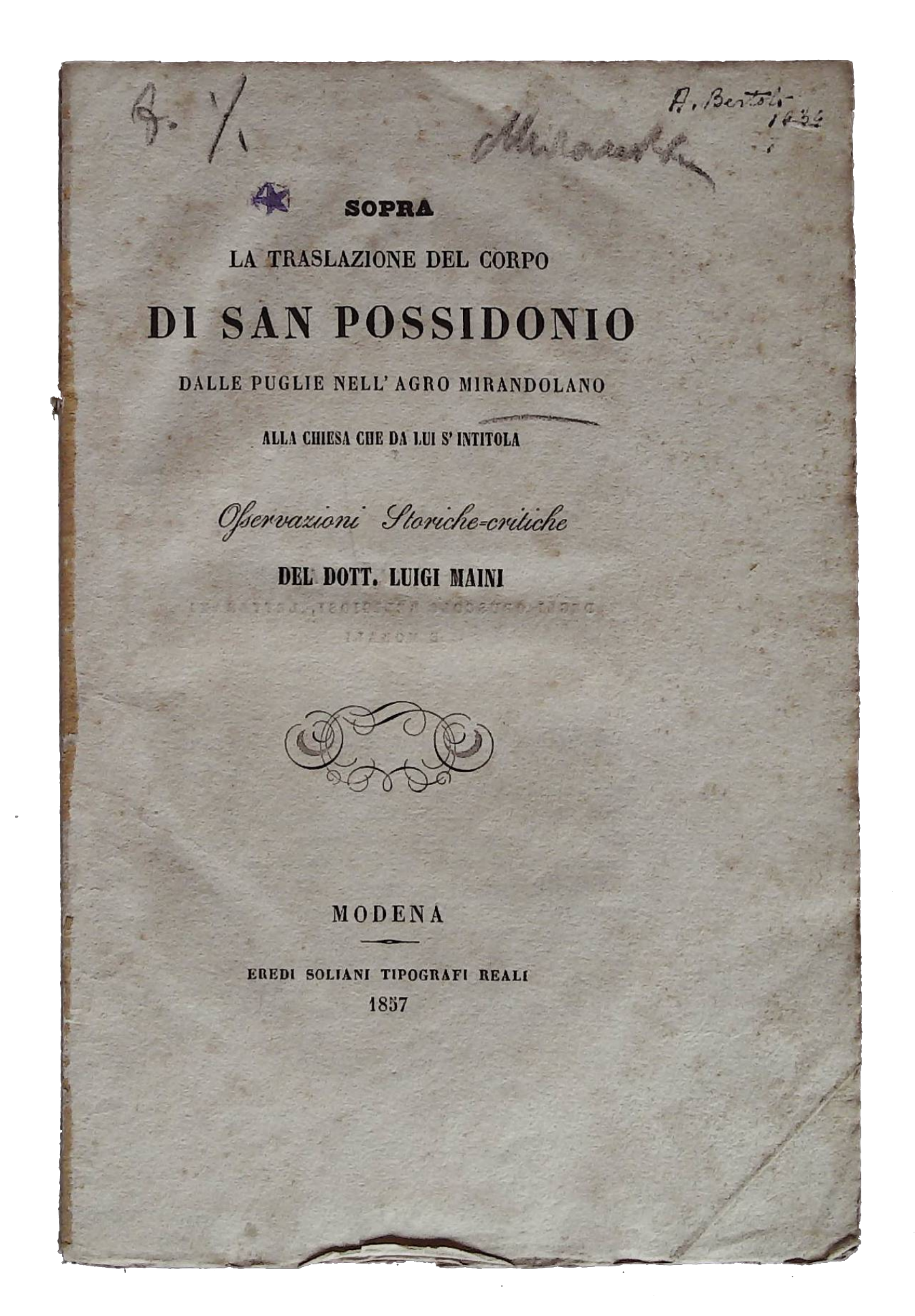 I dubbi sulla veridicità della presunta traslazione delle ossa del santo dalla Puglia a San Possidonio, che da allora prese il nome del Santo, sono ben documentati in questo libretto dello storico dell’800 Luigi Maini.
